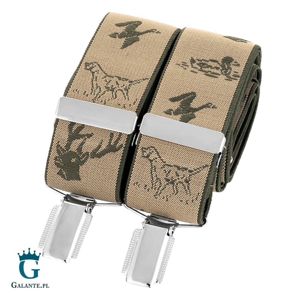 Oto gratka dla każdego miłośnika polowań – eleganckie szelki w beżowym kolorze, ozdobione nadrukiem zwierząt łowieckich i psów myśliwskich. Tematycznie dobrane dodatki do stroju podkreślą Twoją pasję i zaimponują znajomym!