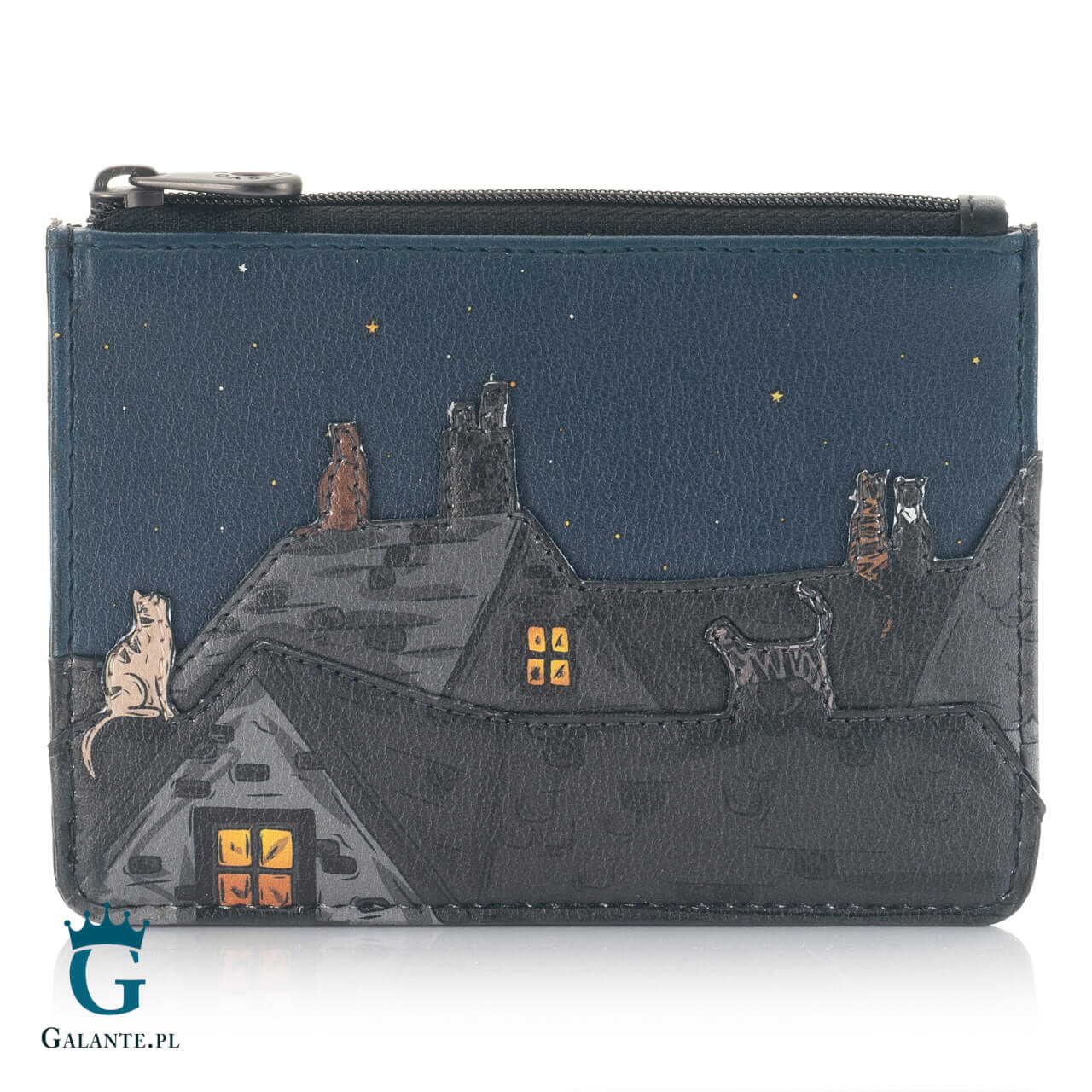 Portfel damski na bilon i karty renomowanej marki Yoshi to wspaniały dodatek dla każdej miłośniczki kotów. Wykonany z miękkiej skóry naturalnej barwionej na klasyczny czarny kolor, został ozdobiony starannie wykonaną naszywką przedstawiającą koty na dachu, wpatrujące się w rozgwieżdżone niebo. Nieco nostalgiczny, bardzo ciepły wzór spodoba się każdej właścicielce puchatego mruczka.