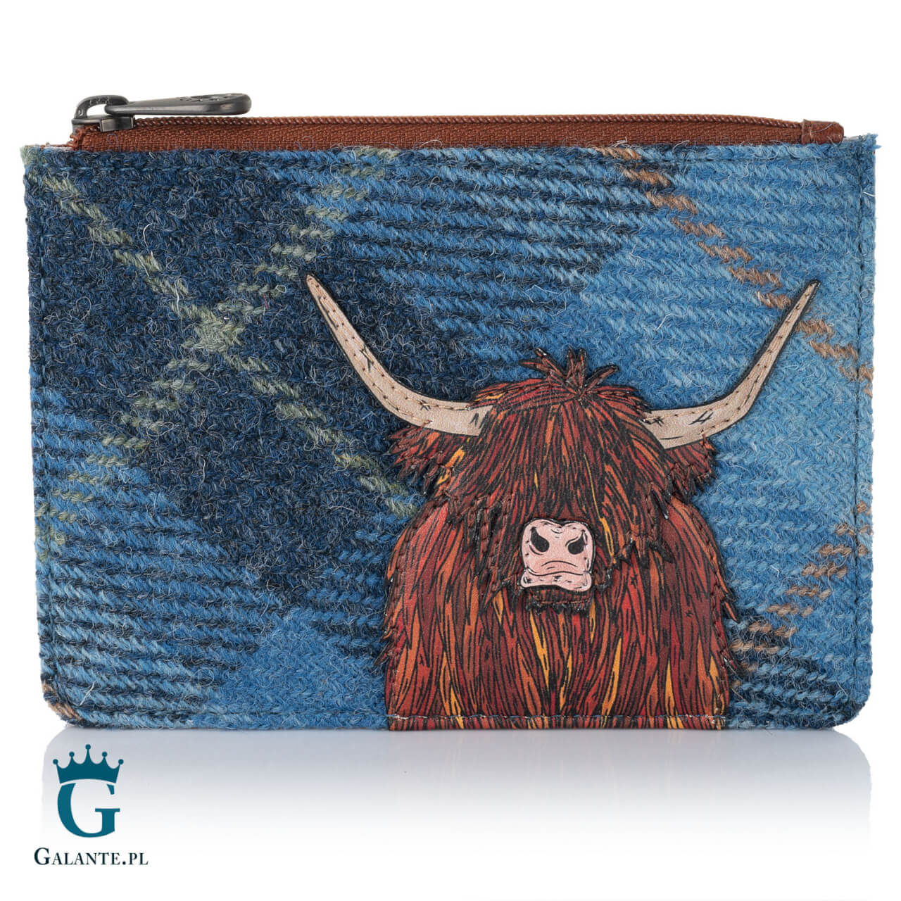 Idealny portfelik dla kobiet, które lubią niewielkie modele, a równocześnie szukają designu innego niż wszystkie. Kolekcja Szkocka Krowa brytyjskiej marki Yoshi została stworzona z połączenia miękkiej skóry naturalnej w kolorze ciepłego brązu i ręcznie tkanego wełnianego tweedu w niebiesko – granatową kratę. Okładkę ozdabia szczegółowo wykonana naszywka szkockiej krowy z charakterystyczną brązową sierścią opadającą na oczy. To idealny wzór dla podróżniczki, miłośniczki zwierząt – oraz każdej kobiety, która uwielbia się wyróżniać z otoczenia.