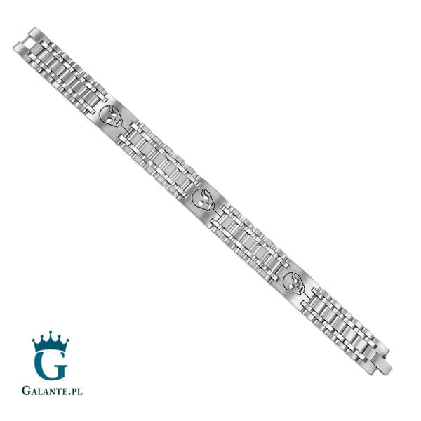 Prezentowana bransoletka wykonana została ze stali nierdzewnej i ma kolor srebrny. Pomiędzy wąskimi ogniwami zostały umieszczone nieco większe blaszki ze wzorami czaszek. Nadają one całości niebanalnego charakteru. Bransoleta jest wykonana z precyzją i świetnie prezentuje się z każdym strojem. Dzięki srebrnemu kolorowi efektownie wygląda niezależnie od okazji.