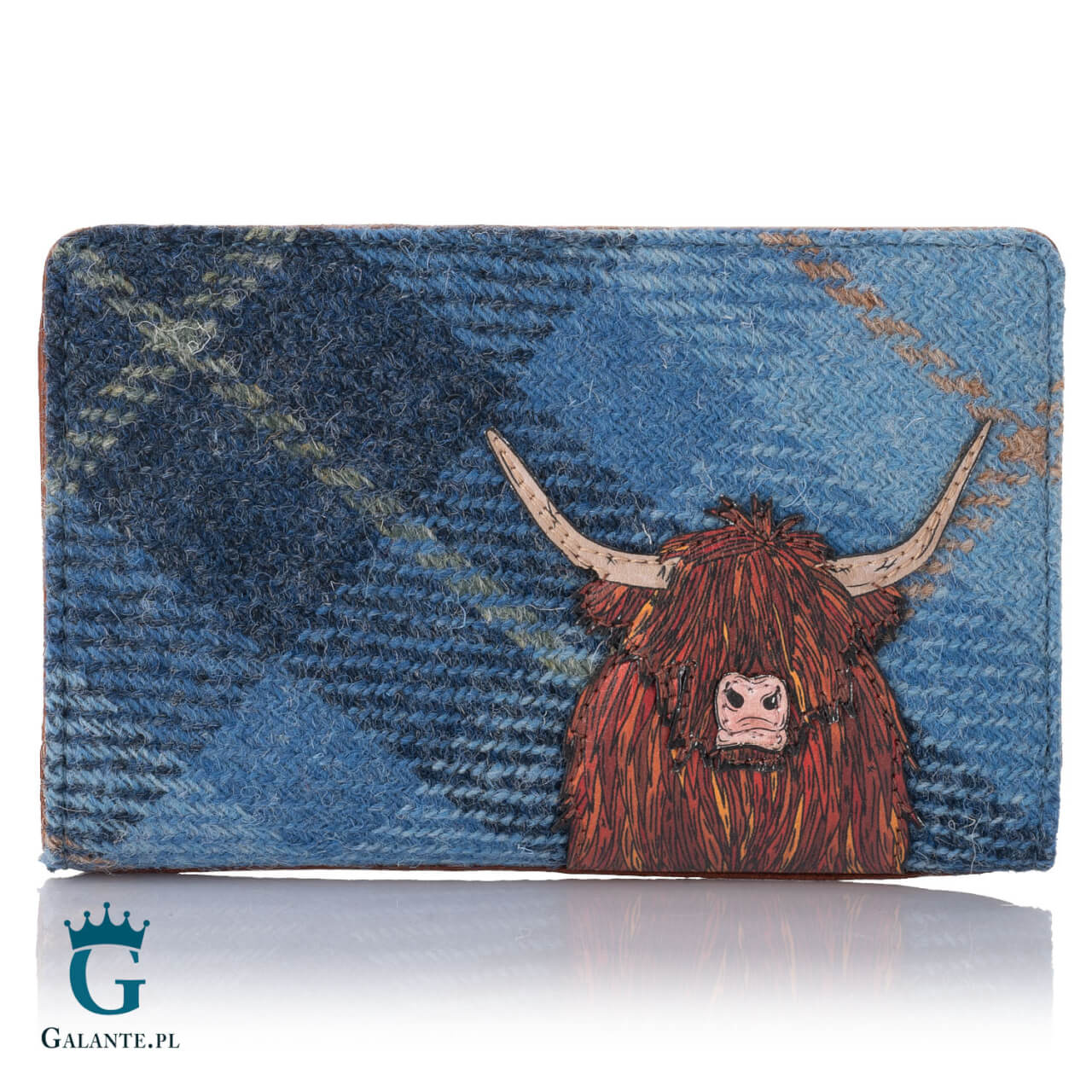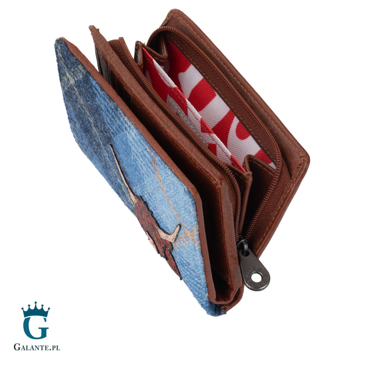 Prezentowany portfel damski brytyjskiej marki Yoshi to idealny dodatek dla każdej podróżniczki, wielbicielki zwierząt lub kobiety, która uwielbia wyróżniać się w towarzystwie. Wykonany z miękkiej skóry naturalnej w ciepłym brązowym kolorze, na okładce jest ozdobiony ręcznie tkanym wełnianym tweedem w niebiesko-granatową kratę i piękną naszywką szkockiej krowy z charakterystyczną brązową sierścią opadającą na oczy. Ten niezwykły design z pewnością przyciągnie uwagę otoczenia!