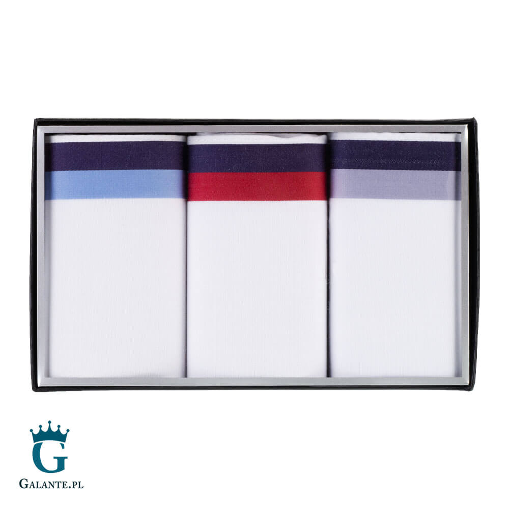 Chusteczki bawełniane niemieckiej marki Lindenmann są niezbędnym uzupełnieniem każdego męskiego stroju. To kwintesencja jakości i elegancji. Powinien je mieć w zasięgu ręki każdy modny mężczyzna. W tym zestawie znajdują się trzy chusteczki w kolorze białym, ozdobione na krawędziach paskami w kontrastowych barwach. Wyjątkowo gustowne, zapakowane w pudełko z przejrzystym wieczkiem, są idealnym prezentem dla męża, taty lub krewnego.