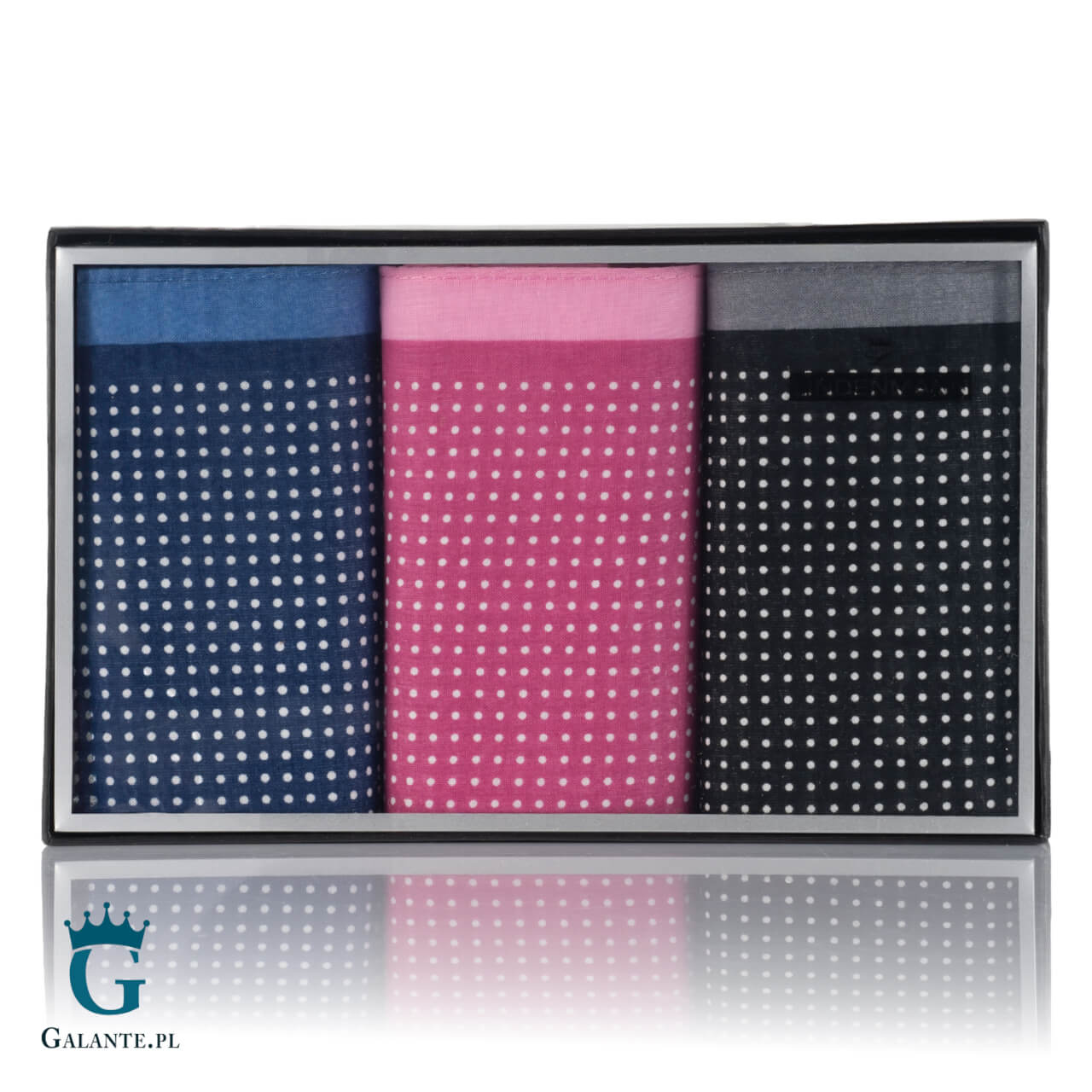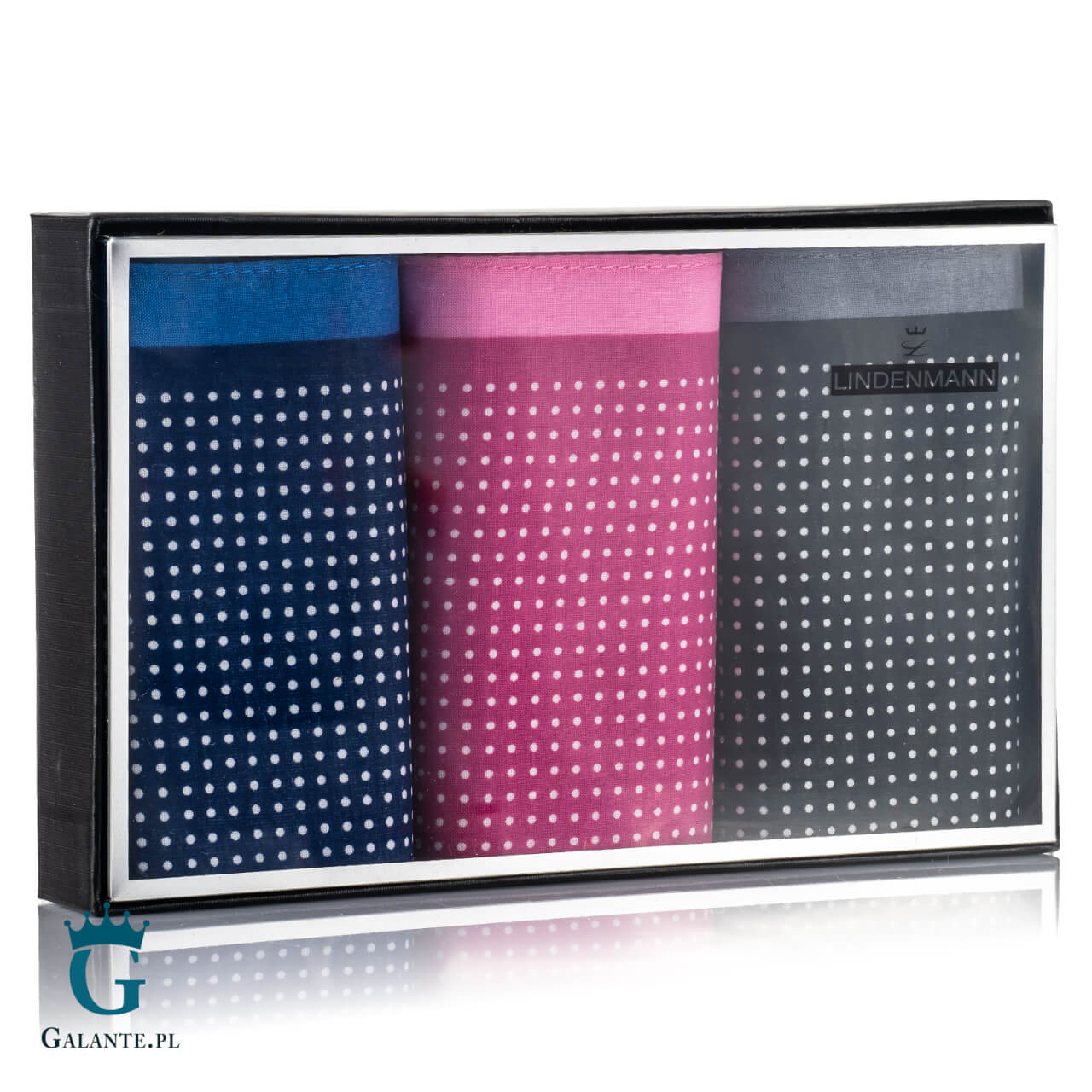 Każdy elegancki mężczyzna powinien posiadać w swojej garderobie zestaw bawełnianych chusteczek. Prezentowany zestaw niemieckiej marki Lindenmann to bardzo gustowne chusteczki w różnych kolorach ozdobione wzorem groszków. Będą świetnym uzupełnieniem wieczorowej stylizacji. W zestawie mamy 3 chusteczki o wymiarach 43 x 43 cm.