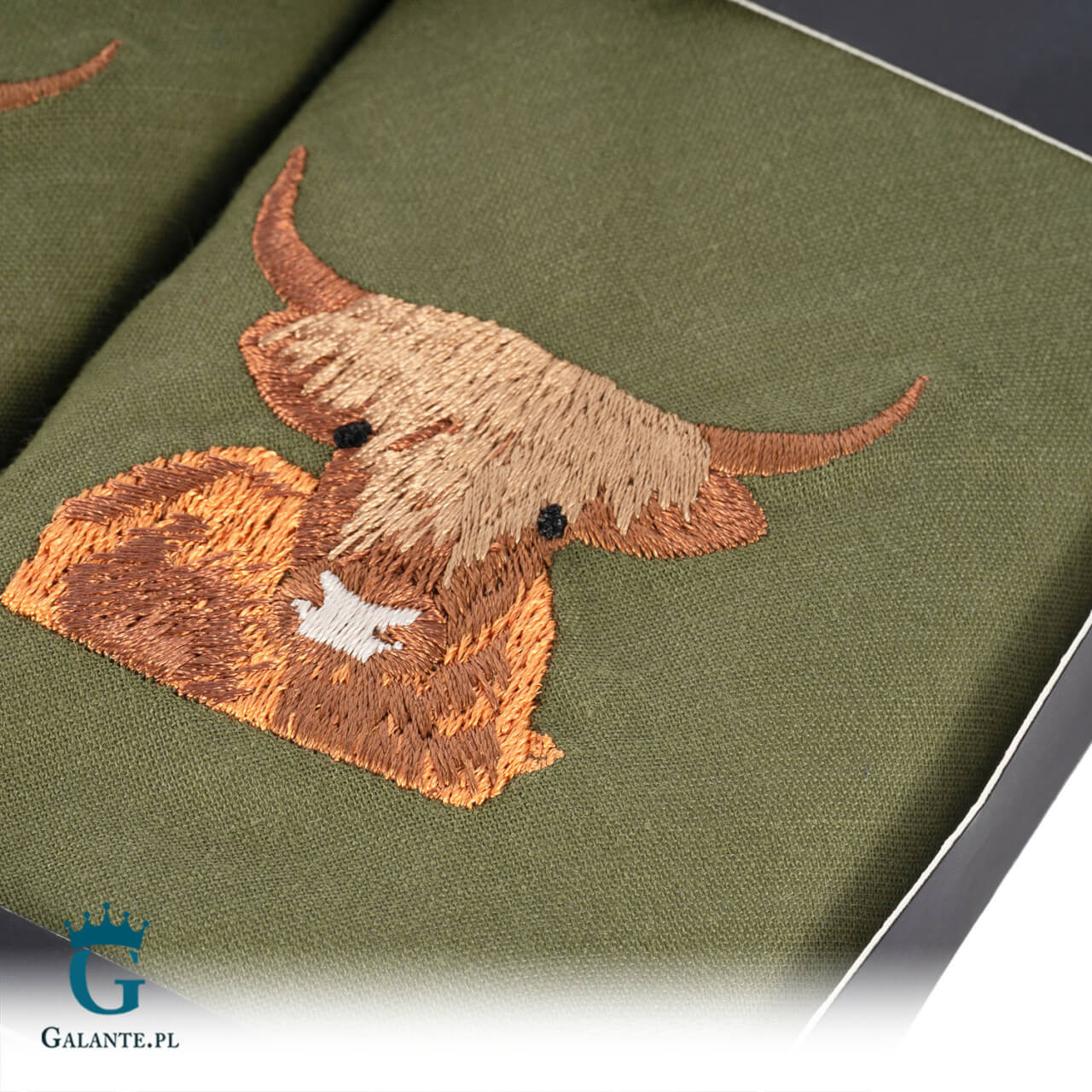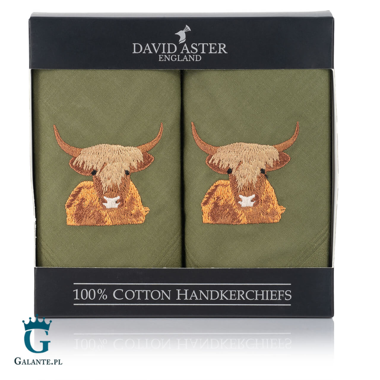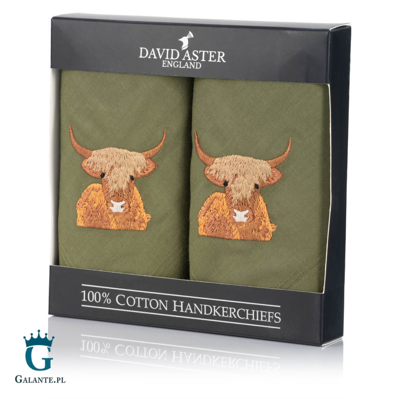 Białe, bawełniane chusteczki to elegancki, ponadczasowy dodatek, który musi znaleźć się w szafie każdego modnego mężczyzny. Prezentowany komplet to idealny prezent dla każdego rolnika, hodowcy lub miłośnika Szkocji. Komplet dwóch zielonych chusteczek wykonanych ze 100% bawełny i ozdobionych haftem charakterystycznych pysków szkockich krów z pewnością wywoła uśmiech na twarzy obdarowanego.