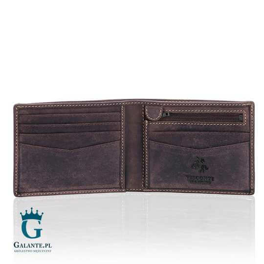 Portfel jest orientacji poziomej, o wymiarach 11 cm x 8,5 cm. Posiada 1 przegrodę na banknoty, kieszeń na bilon zamykaną na zamek błyskawiczny oraz 7 kieszonek, które pomieszczą twoje karty i wizytówki. Możesz wybrać portfel w kolorze ciemno- lub jasnobrązowym. Charakterystyczną cechą tego modelu jest membrana RFID, która chroni przed zdalnym sczytywaniem twoich danych z kart (więcej o technologii RFID przeczytasz tutaj). Dzięki niej dane znajdujące się na kartach nie zostaną wykryte i nie dostaną się w niepowołane ręce.