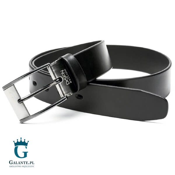 Pasek jest modelem klasycznym – ma kolor czarny i klamrę w kolorze srebrnym. Dzięki temu jest to model, który sprawdzi się w stylizacjach klasycznych, podkreślając powagę danej okazji. Pasek ma szerokość 3,5 cm i posiada pięć dziurek, które rozmieszczone są w odstępach wynoszących 2,5 cm. Klamra ma klasyczny kształt i została wykonana ze stali szlachetnej.