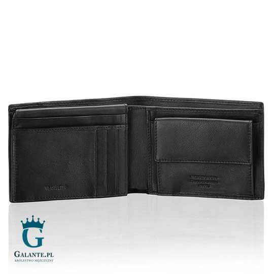 Portfel zawiera 2 przegrody na banknoty, kieszeń na bilon zamykaną na zatrzask, a także 8 przegródek, w tym dwie osiatkowane. W jednej z osiatkowanych kieszonek możesz przechowywać dowód rejestracyjny dzięki jej wymiarom. Portfel ma kolor czarny, a na zewnętrznej stronie widnieje bordowy wzór oraz logo Pierre Cardin. Dzięki gładkiej powierzchni portfel jest bardzo miły w dotyku i elegancki.