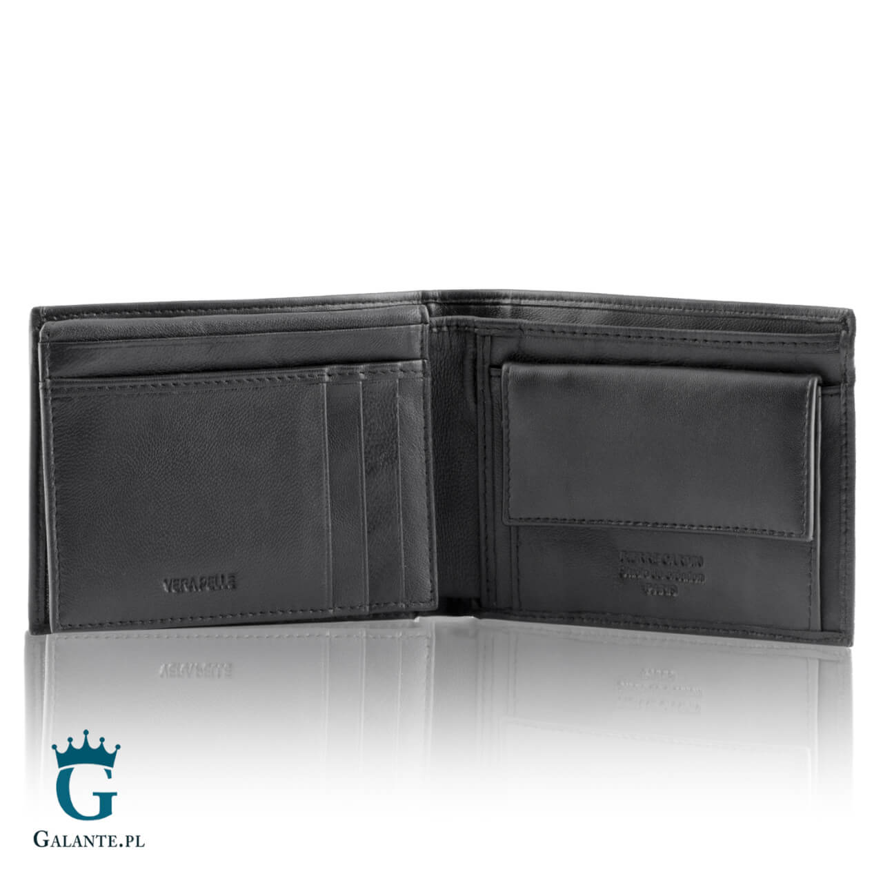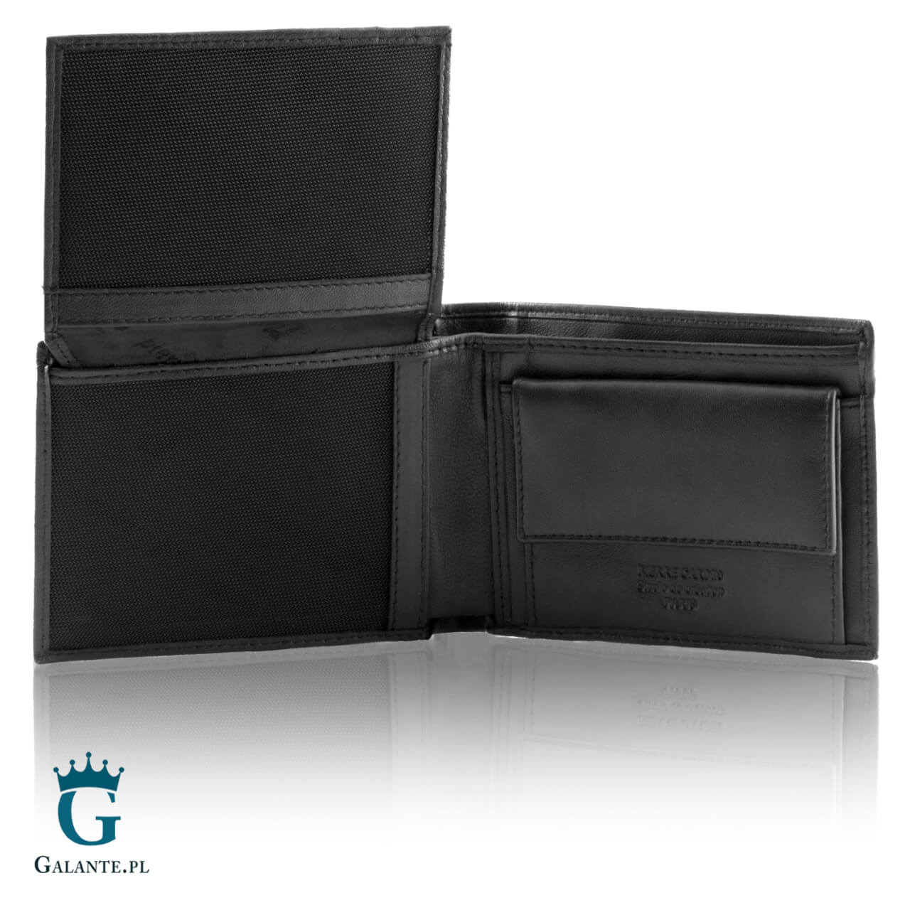 Portfel posiada kieszonkę na bilon zamykaną na zatrzask, 2 przegrody na banknoty oraz 8 kieszonek na karty i dokumenty, w tym dwie osiatkowane. Portfel wykonany został ze skóry naturalnej i ma gładką powierzchnię, dzięki czemu jest niezwykle przyjemny w dotyku.