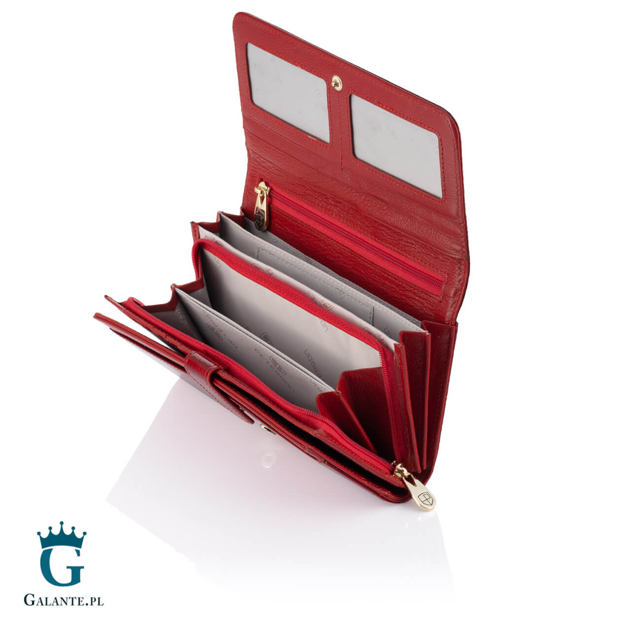 Portfel wykonany z najwyższej jakości skóry naturalnej, delikatnie karbowanej, barwionej na klasyczną czerwień. Portfel jest lakierowany i ręcznie polerowany, przez co prezentuje się niezwykle luksusowo. Całości dopełniają okucia w kolorze złotym. To model dla kobiet, które cenią klasykę i stawiają na ponadczasową elegancję.