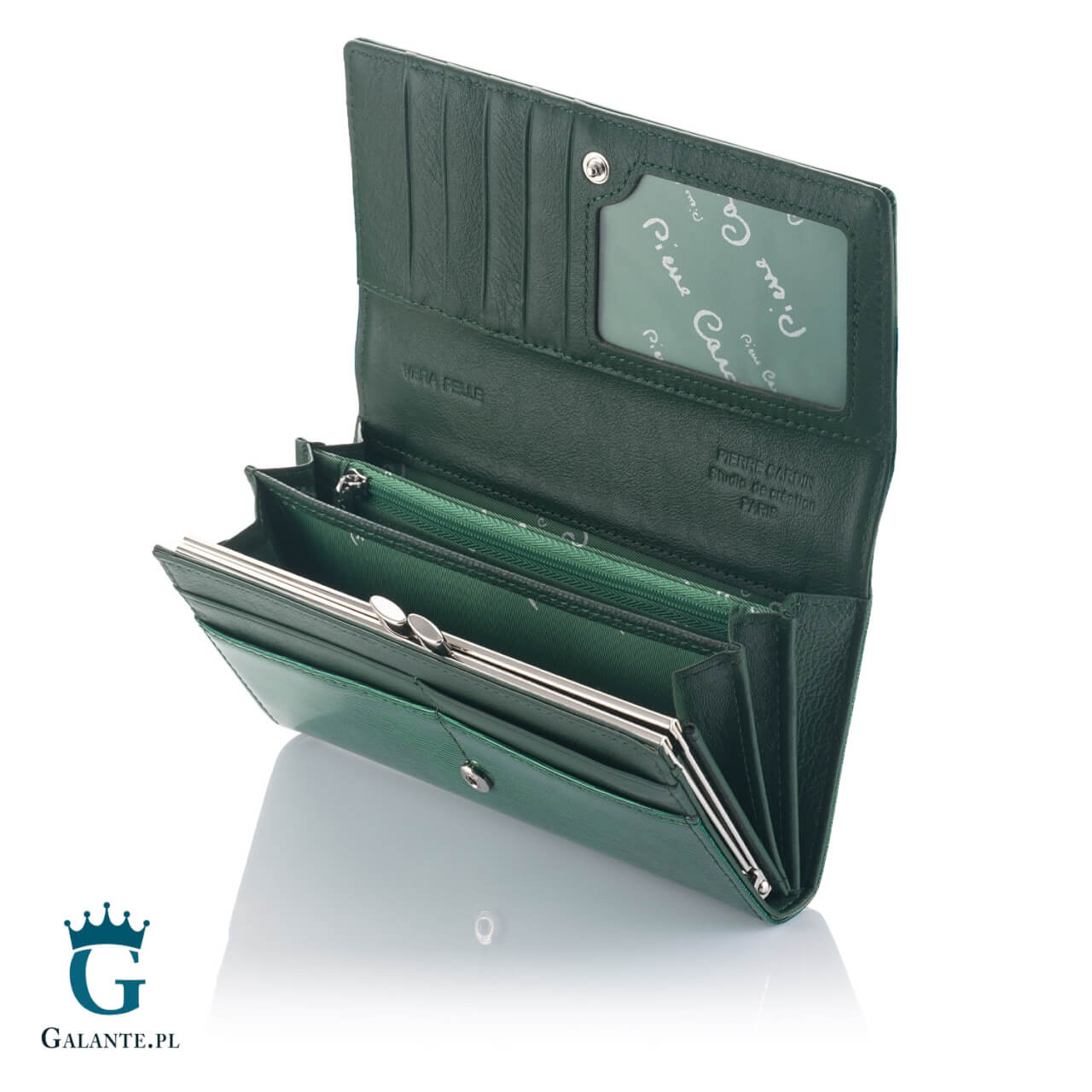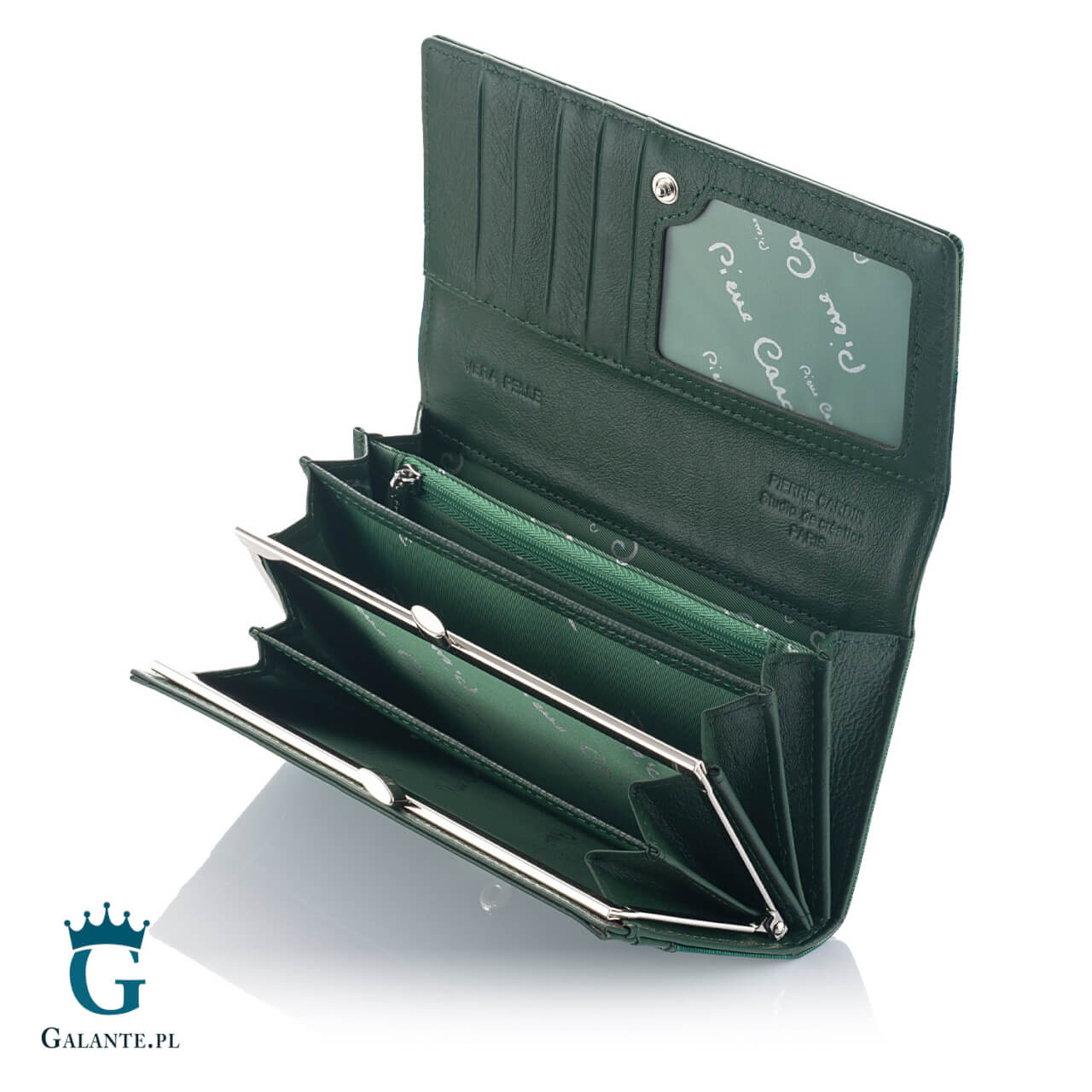 Jest to portfel duży, z wieloma miejscami na karty i inne drobiazgi. Wymiary to 18,5 cm szerokości, 8 cm wysokości i 3,5 cm grubości, orientacja pozioma. W środku znajduje się aż 9 miejsc na karty, 3 przegrody na banknoty, osobna, zamykana na bigiel kieszeń na monety, miejsce na zdjęcie oraz kilka dodatkowych kieszonek w tym jedna na zamek.