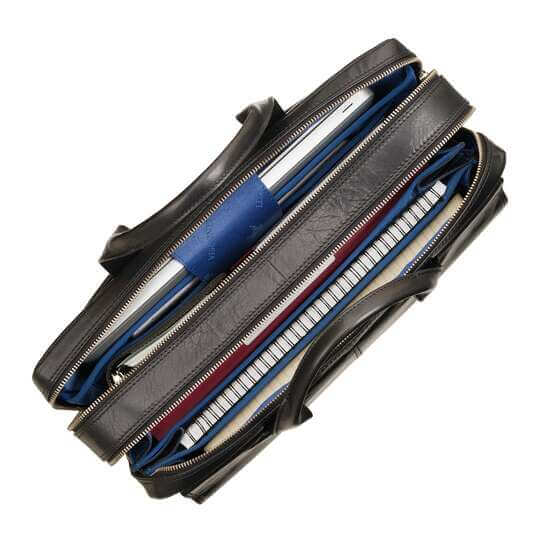 Torba posiada dwie główne komory, zapinane na zamki błyskawiczne. W każdej komorze znajdują się dodatkowo dwie kieszenie na notesy, książki lub dokumenty. W kieszeniach zmieszczą się również laptop 15” (jedna z kieszeni została zwymiarowana pod Macbook Pro, 38 x 21 cm) oraz Ipad lub tablet (34 x 18 cm). Komory i kieszenie są obszyte solidną warstwą mieszanki bawełnianej w ciemnoniebieskim kolorze.