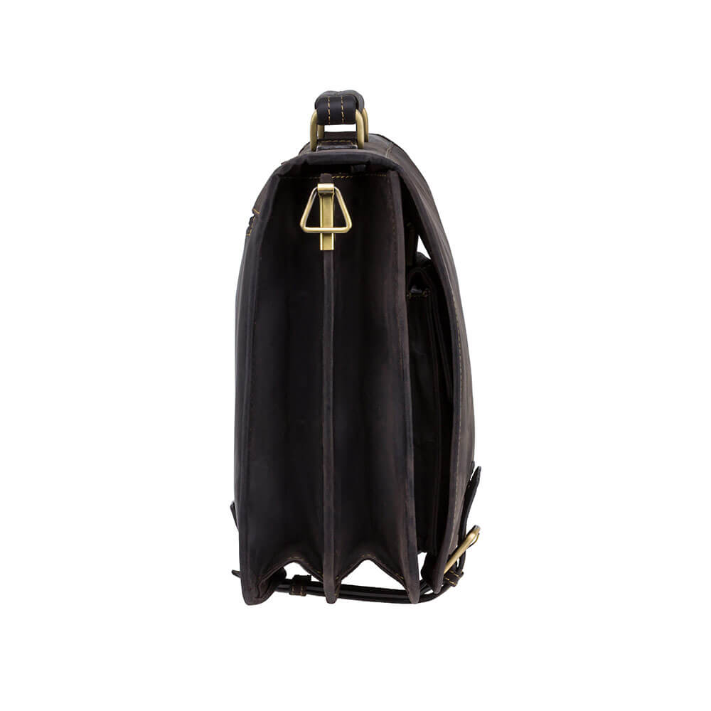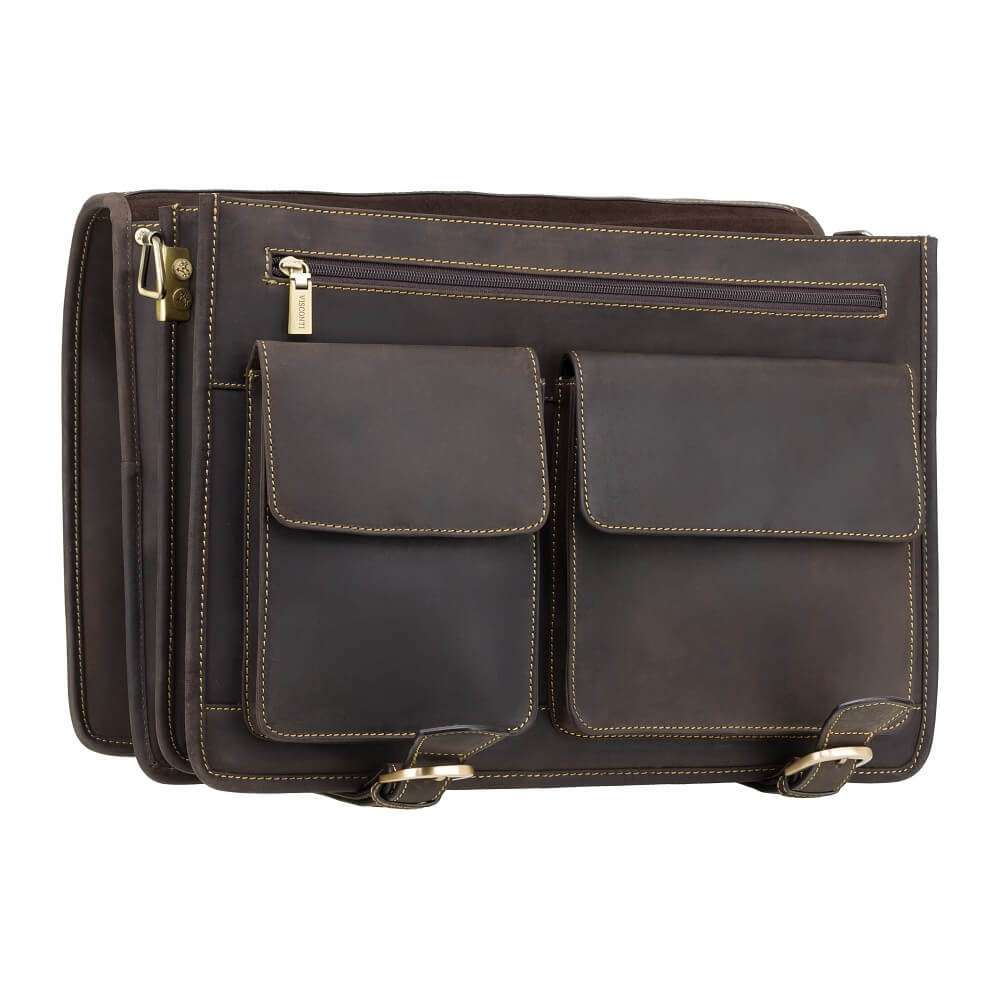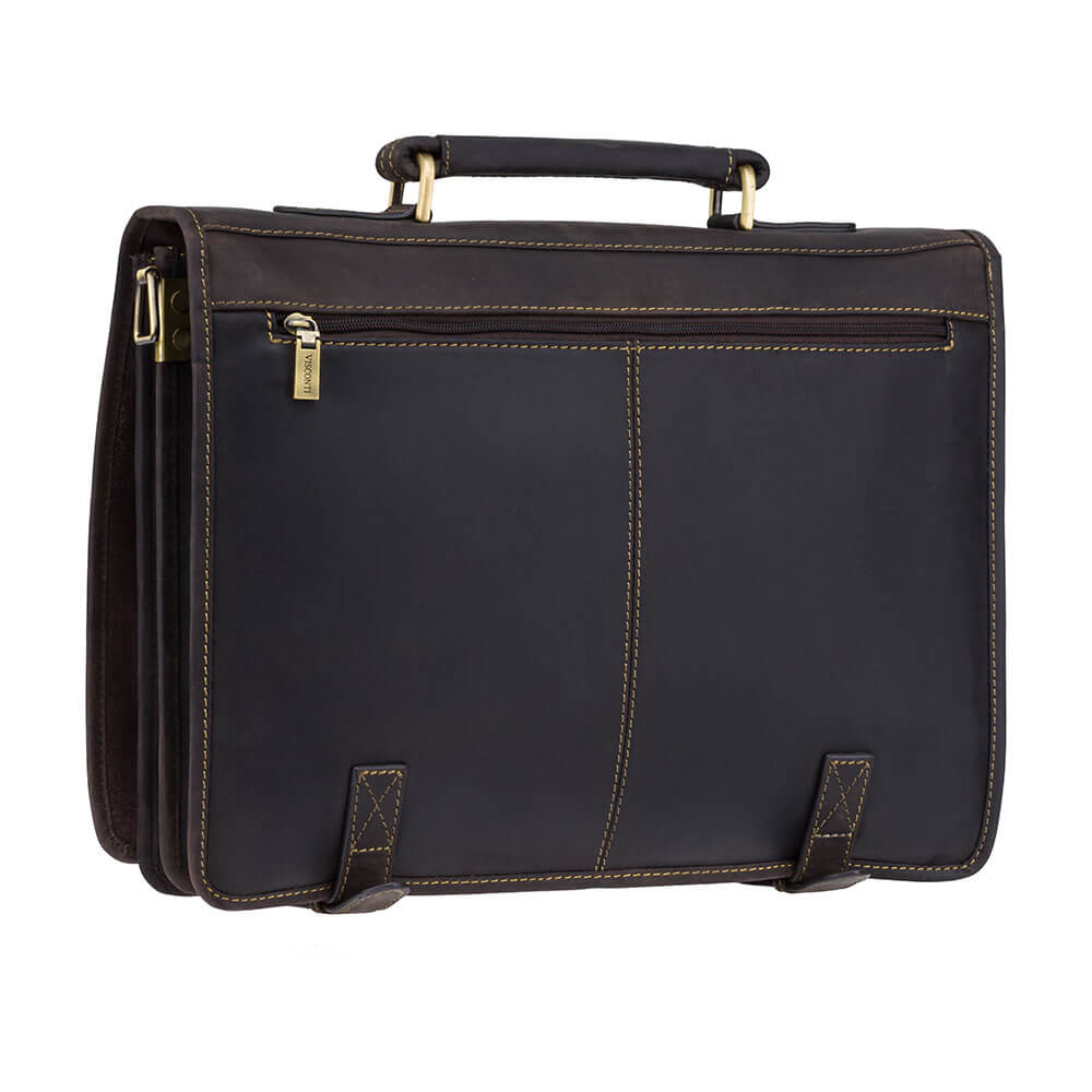 Skórzana teczka brytyjskiej marki Visconti wyróżnia się pojemnością oraz wieloma przegrodami i kieszeniami, które pozwalają precyzyjnie sortować dokumenty, niezbędną do pracy elektronikę i inne drobiazgi. Wykonana z wysokiej jakości skóry naturalnej, z bardzo solidnymi przeszyciami i mocnymi metalowymi elementami, a także grubą poszewką z mieszanki bawełnianej, będzie służyć właścicielowi długie lata. Skóra została zakonserwowana metodą olejowania, co nadaje jej unikalny efekt patyny (lekko przypomina skórę nubuk).