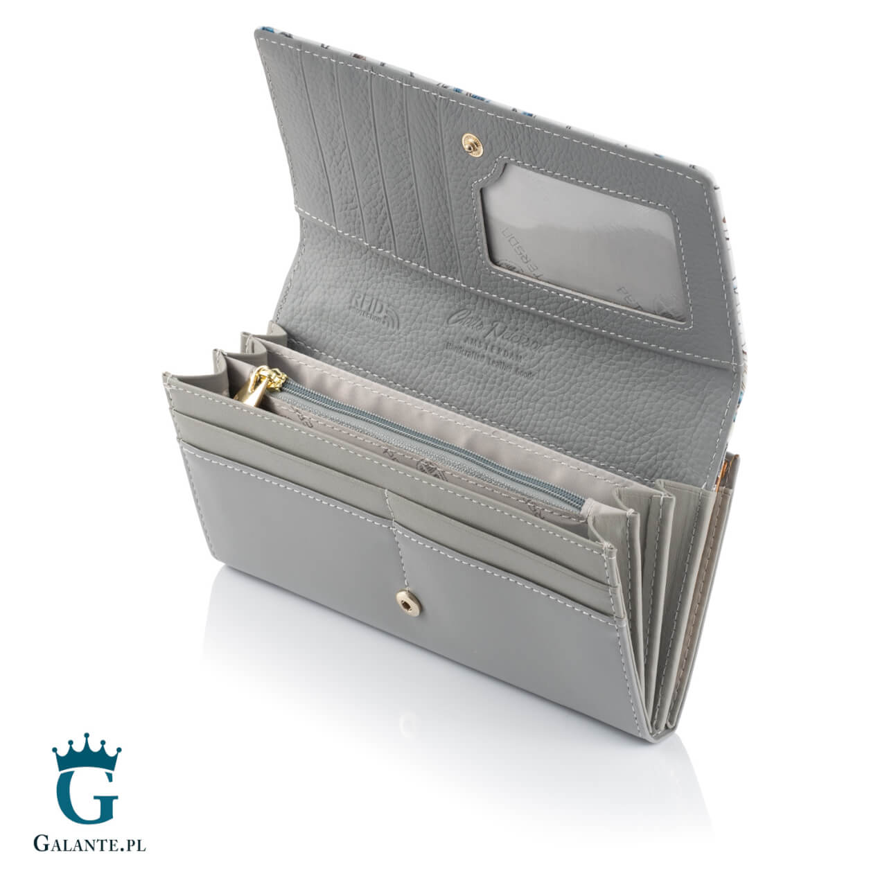 Wymiary portfela to 18,5 cm szerokości, 9,5 cm wysokości i 4 cm grubości. Portfel posiada:
