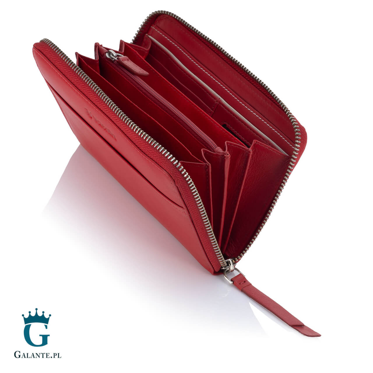 Model 154-820 to duży poziomy portfel zapinany na zamek. Wymiary to 18 cm długości i 10,5 cm wysokości. Portfel jest wykonany z czerwonej skóry naturalnej, bardzo przyjemnej w dotyku, a przy tym odpornej na uszkodzenia. Okładka została wykończona stylowym przeszyciem i tłoczeniem logo producenta. To idealny portfel dla kobiety sukcesu i każdej Pani, która potrzebuje sporo miejsca na karty, gotówkę i inne drobiazgi.