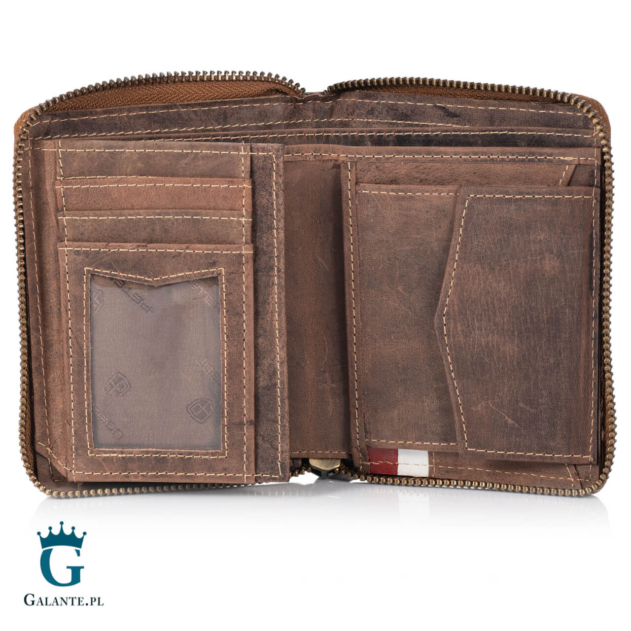 Portfel jest dość duży, o wymiarach 12,5 x 10 cm, orientacji pionowej. Jest bezpiecznie zamykany na zamek błyskawiczny. W środku znajdziemy: 2 przegrody na banknoty, kieszeń na drobne zamykaną na zatrzask, 6 miejsc na karty, 2 przezroczyste okienka na dowód osobisty lub zdjęcie bliskiej osoby i 3 dodatkowe przegródki na drobiazgi. Portfel posiada również ochronę RFID, która zabezpiecza karty i dokumenty przed zdalnym kopiowaniem i kradzieżą danych.