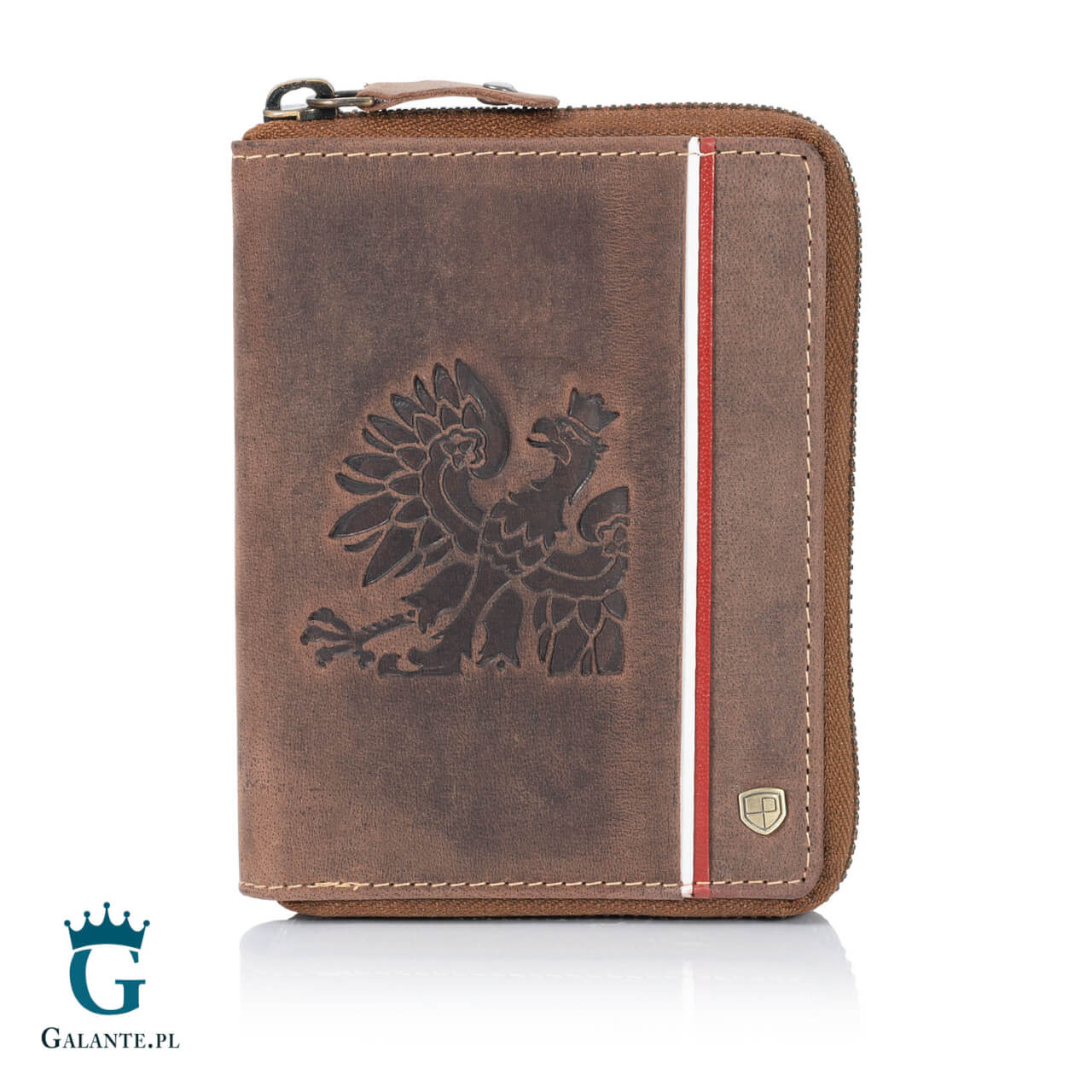 Model 340P-03 został wykonany z miękkiej i przyjemnej w dotyku skóry naturalnej nubuk w kolorze brązowym. Skóra nubukowa jest wyjątkowo trwała i odporna na uszkodzenia, więc portfel będzie służył właścicielowi długie lata. Cechą charakterystyczną tego portfela jest wytłoczony na okładce obraz Orła Polskiego oraz motyw biało-czerwonej flagi. To wspaniały dodatek dla każdego mężczyzny, który kocha Ojczyznę i uważa się za patriotę.