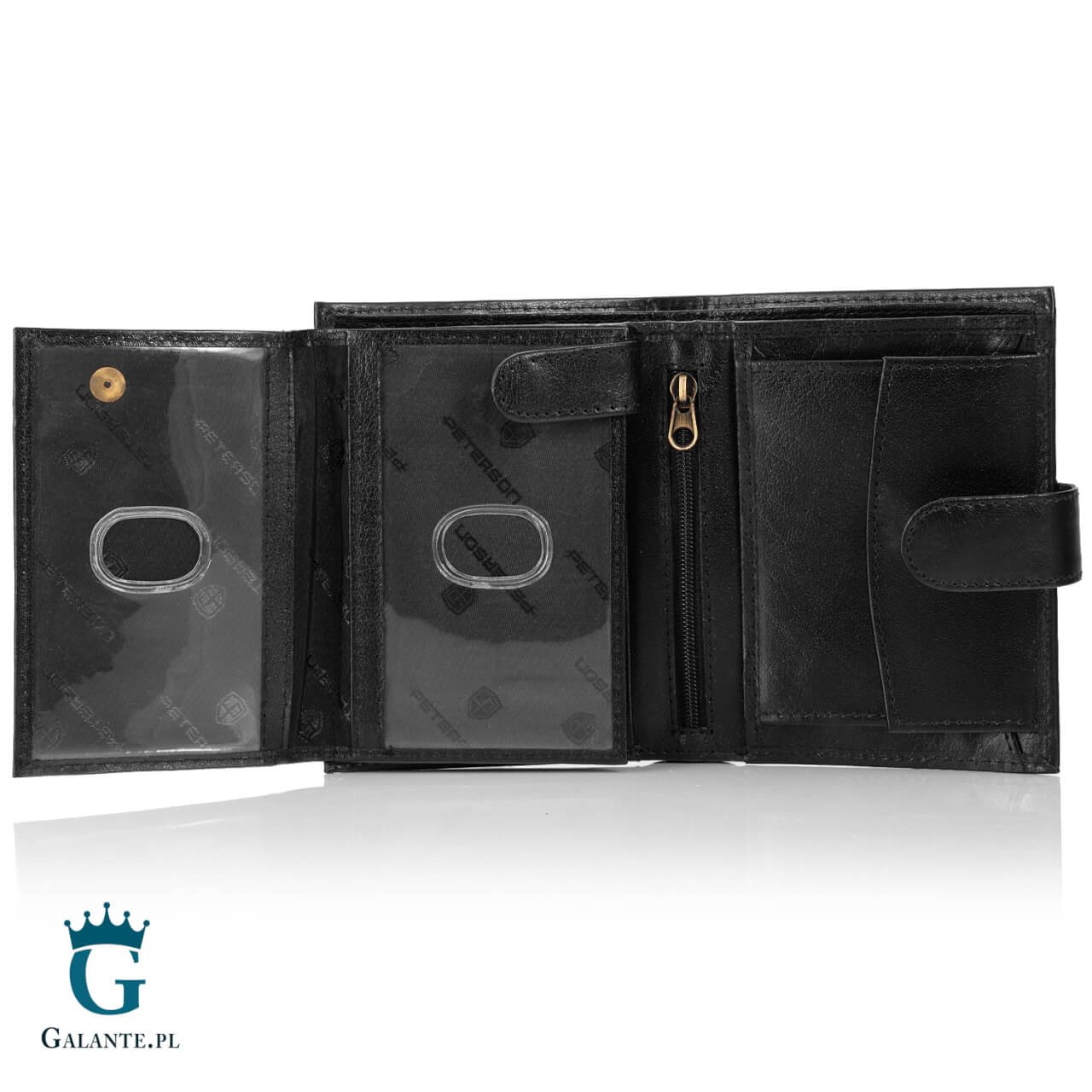 Model Peterson 339Z został wykonany ze skóry naturalnej w klasycznym czarnym kolorze. Dyskretne metalowe logo i tłoczenie nazwy producenta stanowi eleganckie wykończenie okładki. Portfel jest zamykany na zatrzask.