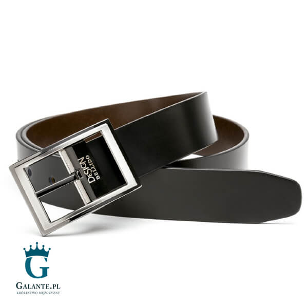 Pasek jest modelem dwustronnym, więc jednocześnie niezwykle uniwersalnym. Z jednej strony ma on kolor czarny, a z drugiej brązowy, dzięki czemu jeden pasek może być idealnym dodatkiem do dwóch różnych stylizacji. Model jest całkowicie gładki, dlatego odpowiednio komponuje się ze strojem oficjalnym i dyskretnie dodaje szyku outfitowi codziennemu. Szerokość paska wynosi 3,5 cm, a suma dziurek wynosi pięć – dzielą je 2,5 centymetrowe odstępy. Klamra ma kwadratowy kształt i kolor srebrny.