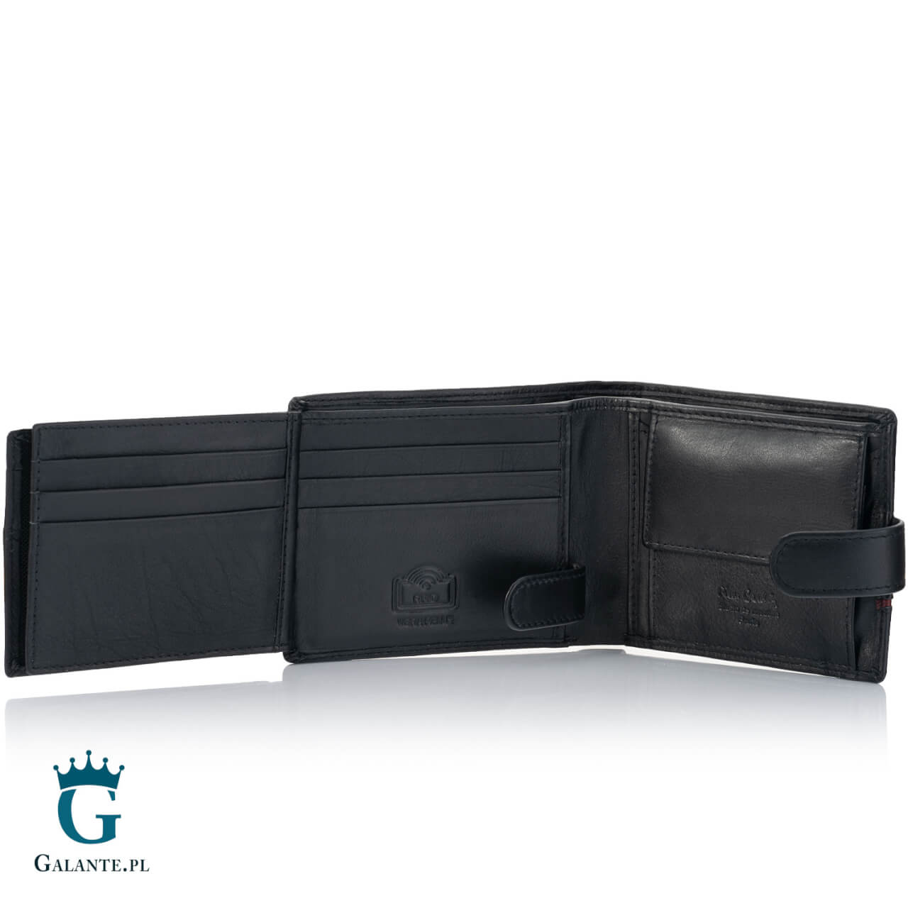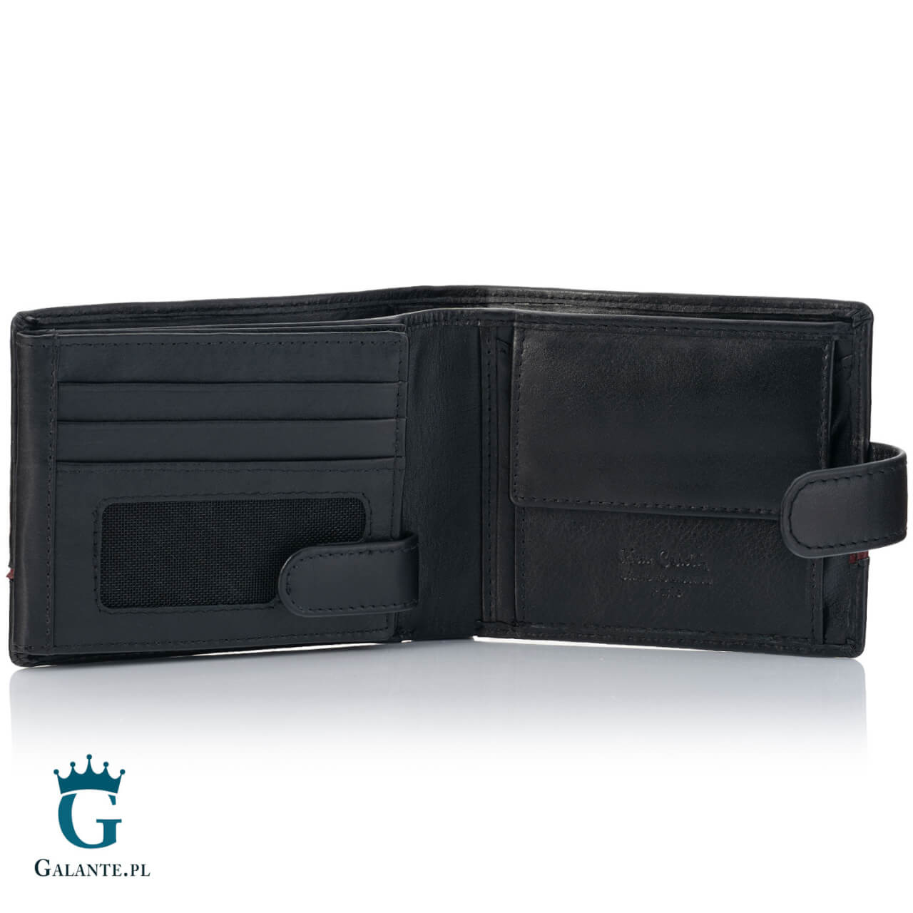Portfel jest wykonany z miękkiej skóry naturalnej, bardzo przyjemnej w dotyku i odpornej na uszkodzenia. W tym modelu możesz wybrać jedną z dwóch opcji: portfel czarny z czerwonym paskiem lub wersję z dodatkiem w kolorze czarnym. Obie wersje są bardzo eleganckie, a oprócz wzoru ozdabiającego zewnętrzną stronę portfela, znajduje się tam charakterystyczne logo marki Pierre Cardin.
