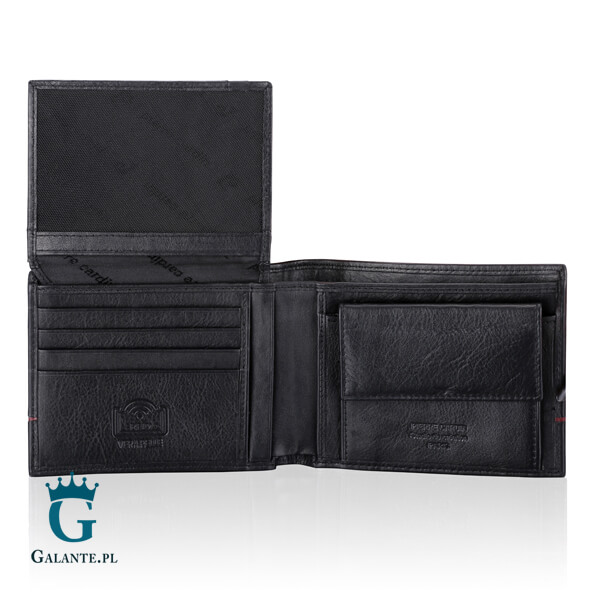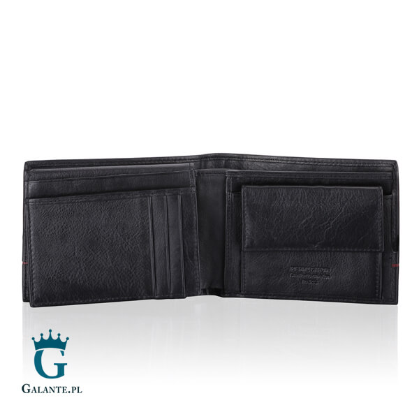 W tym modelu możesz wybrać jedną z dwóch opcji: portfel czarny z czerwonym paskiem lub wersję z dodatkiem w kolorze granatowym. Obie wersje są bardzo eleganckie, a oprócz wzoru ozdabiającego zewnętrzną stronę portfela, znajduje się tam charakterystyczne logo marki Pierre Cardin.