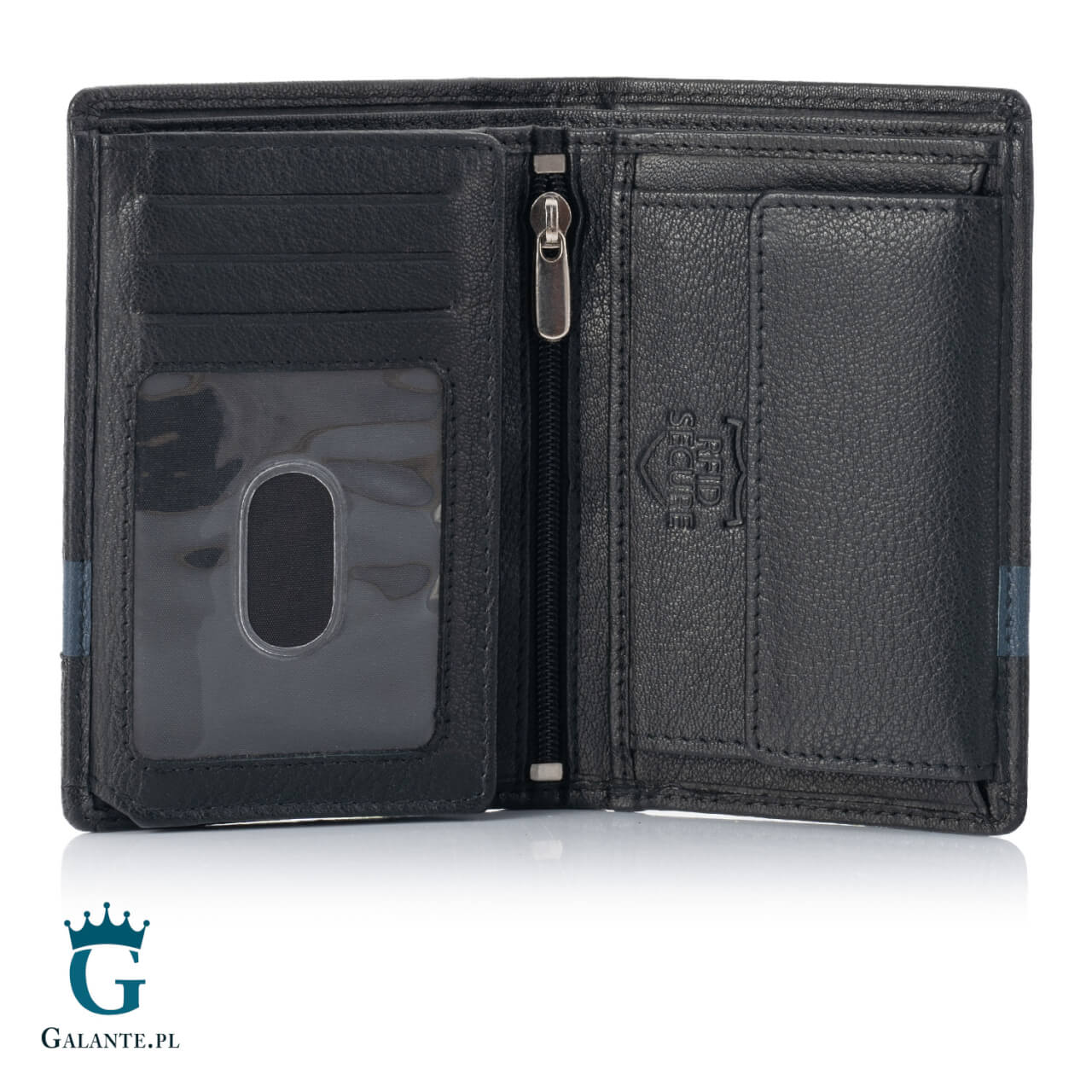 - czarny portfel z czerwonym paskiem na okładce, czyli klasyczne połączenie Black & Red