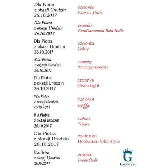 Wykonanie grawerunku następuje w ciągu 24 godzin w dni robocze od momentu zaksięgowania wpłaty, a wybór rodzaju i rozmiaru czcionki należy do Ciebie (prosimy o podanie treści, miejsca znakowania i wybranego rozmiaru w oknie „Tekst do grawerunku”).