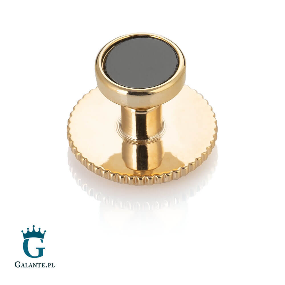 Jako strój wieczorowy, smoking wymaga najlepszych i odpowiednio dobranych dodatków. Guziki są niezbędnym elementem każdego smokingu i częścią eleganckiej stylizacji. Prezentowany model to zestaw wykonany z pozłacanej stali szlachetnej, ozdobionej czarną masą jubilerską, która wspaniale kontrastuje ze złotą oprawą. Są to dwuczęściowe guziki zapinane na wkrętkę. W zestawie znajduje się 5 guzików o średnicy ok. 7 mm.