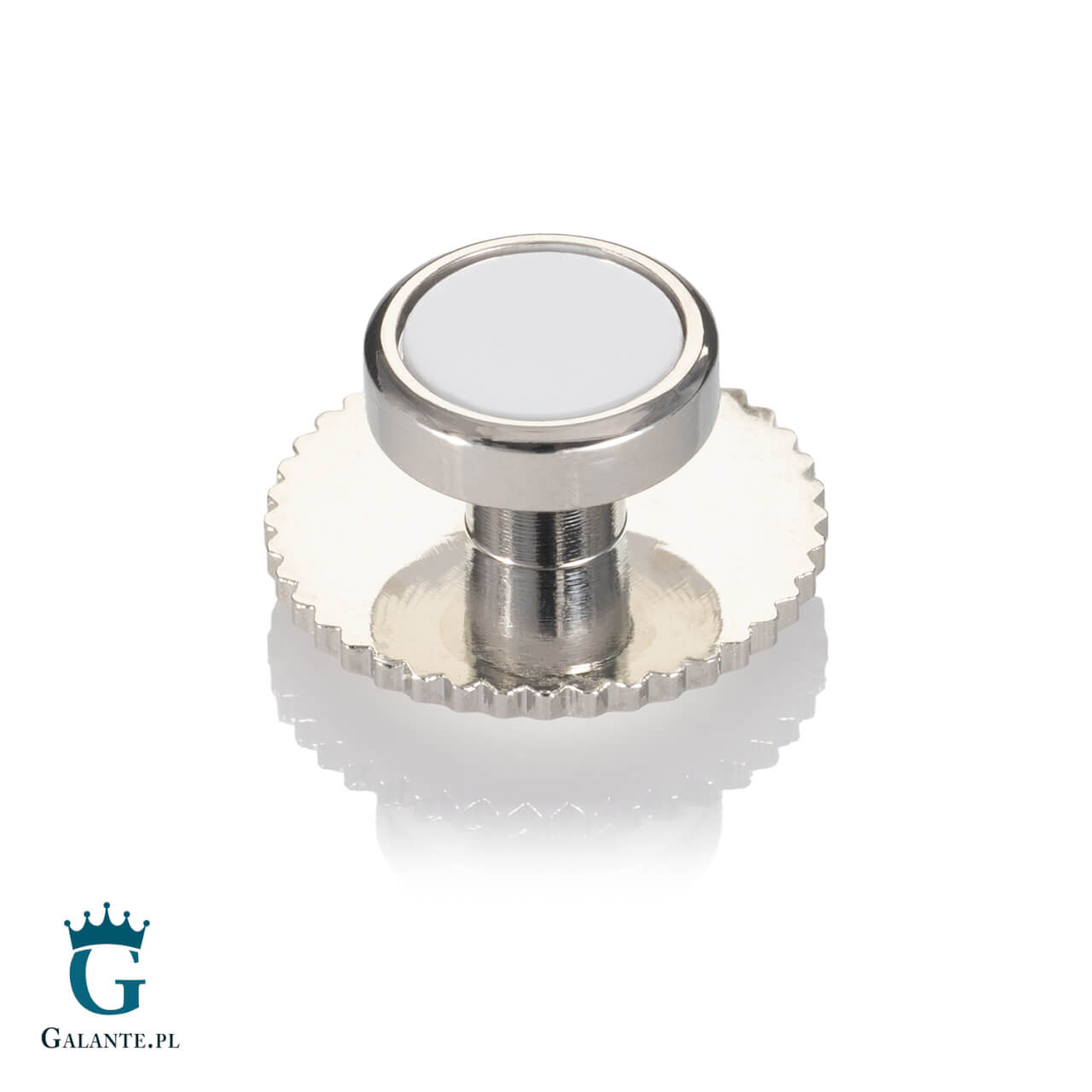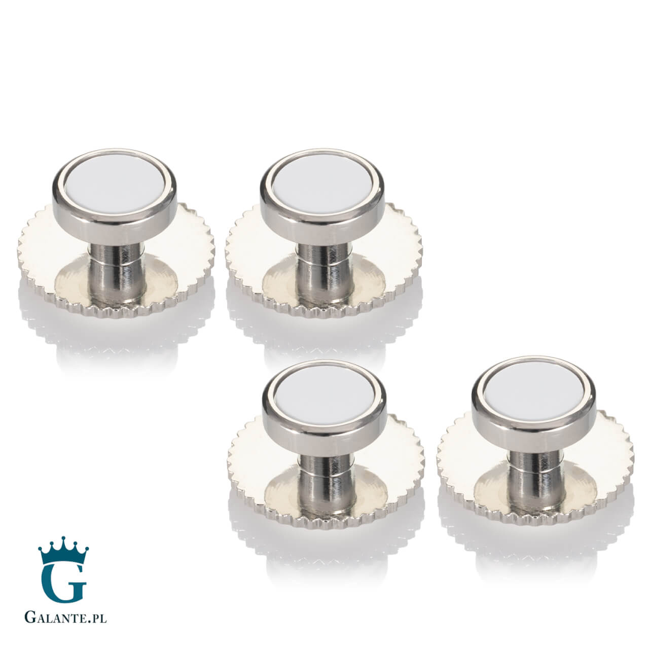 Prezentowane guziki smokingowe to niezbędny element do każdego smokingu. Każda koszula ozdobiona eleganckimi guzikami prezentuje się klasycznie i gustownie. Guziki są dwuczęściowe i zapinane na wkrętkę. Są ozdobami najwyższej jakości – wykonane zostały ze stali szlachetnej. Mają kolor srebrny, a centralna część jest ozdobą z białej masy jubilerskiej. W komplecie znajduje się 4 guziki.