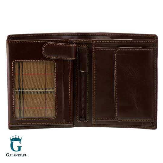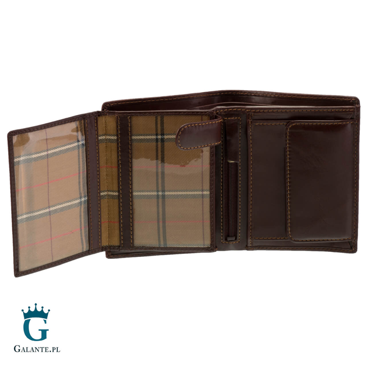 Portfel posiada: kieszeń na bilon zamykaną na zatrzask, 2 przegrody na banknoty, 8 miejsc na karty kredytowe lub dokumenty, 3 kieszonki wewnętrzne, w tym jedna podwójna zamykana na suwak, 3 kieszonki z przeźroczystymi okienkami, idealne na zdjęcie bliskiej osoby bądź ważny dokument. Wymiary portfela to 9,5 cm szerokości i 12 cm wysokości. Portfel jest dostępny w dwóch wersjach kolorystycznych – czarny oraz ciemny brąz.