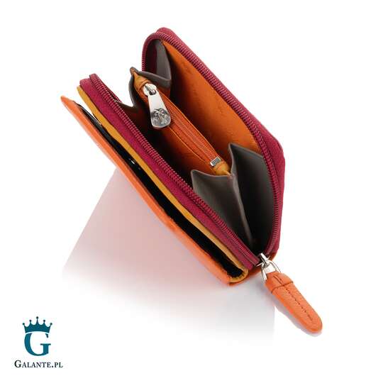 Portfel posiada dwie części. W zapinanej na na zamek, podwójnej kieszeni na monety znajduje się dodatkowa, również zamykana na zamek kieszonka na szczególnie ważne drobiazgi. W drugiej części portfela, zapinanej na zatrzask, znajduje się: przegroda na banknoty, 6 miejsc na karty płatnicze oraz 2 dodatkowe kieszonki na dokumenty. Dodatkowo z tyłu portfel posiada wygodną zewnętrzną kieszonkę, idealną na przechowanie np. biletu parkingowego lub innych drobiazgów, które chcemy mieć pod ręką.