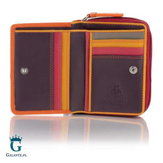 Ten mały portfelik damski brytyjskiej marki Visconti spodoba się każdej kobiecie, która preferuje kompaktowe, dobrze leżące w dłoni portfele skórzane. Portfel zachwyca jakością miękkiej, pachnącej skóry naturalnej, oryginalnymi barwami i doskonałym wykończeniem. Efektowne połączenie różnych odcieni jednego dominującego koloru – różu, błękitu, limonki lub pomarańczy – wprowadzi Cię w pozytywny nastrój nawet w środku pracowitego i męczącego dnia!