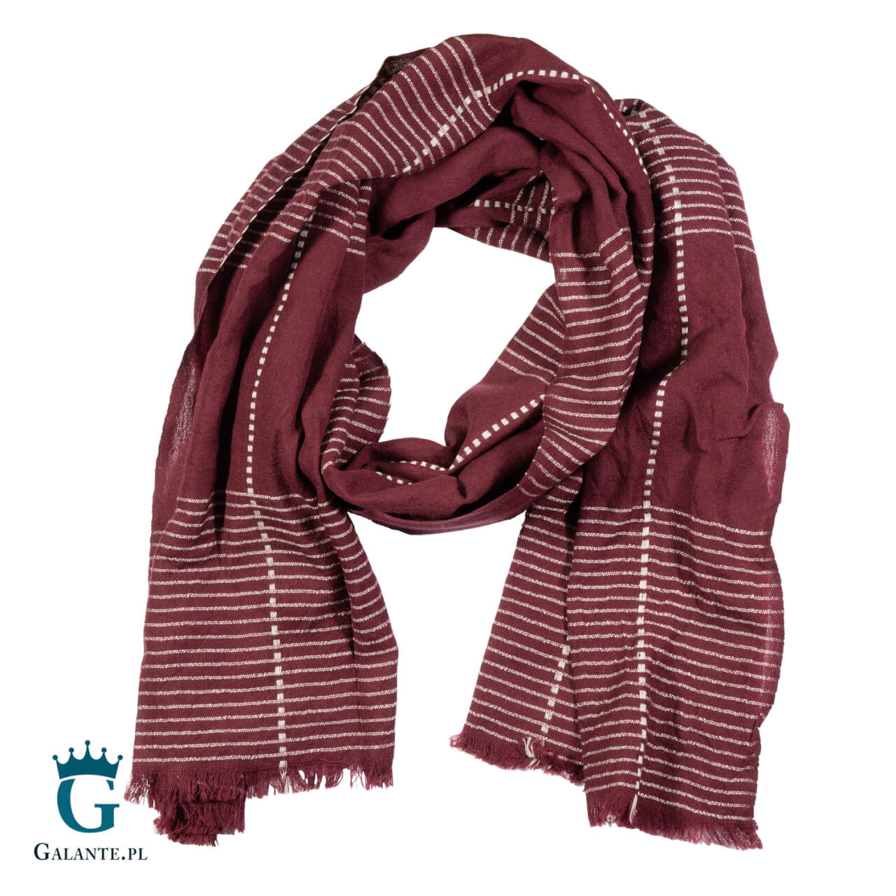 Długi szal męski w bordowym kolorze ozdobiony białymi paskami idealnie sprawdzi się podczas jesiennych chłodnych wieczorów. Dość lekki, ale wykonany ze 100% wełny, ogrzeje kark i zapobiegnie przeziębieniu 🙂 Długość szala sprawia, że można go układać na wiele różnych sposobów.