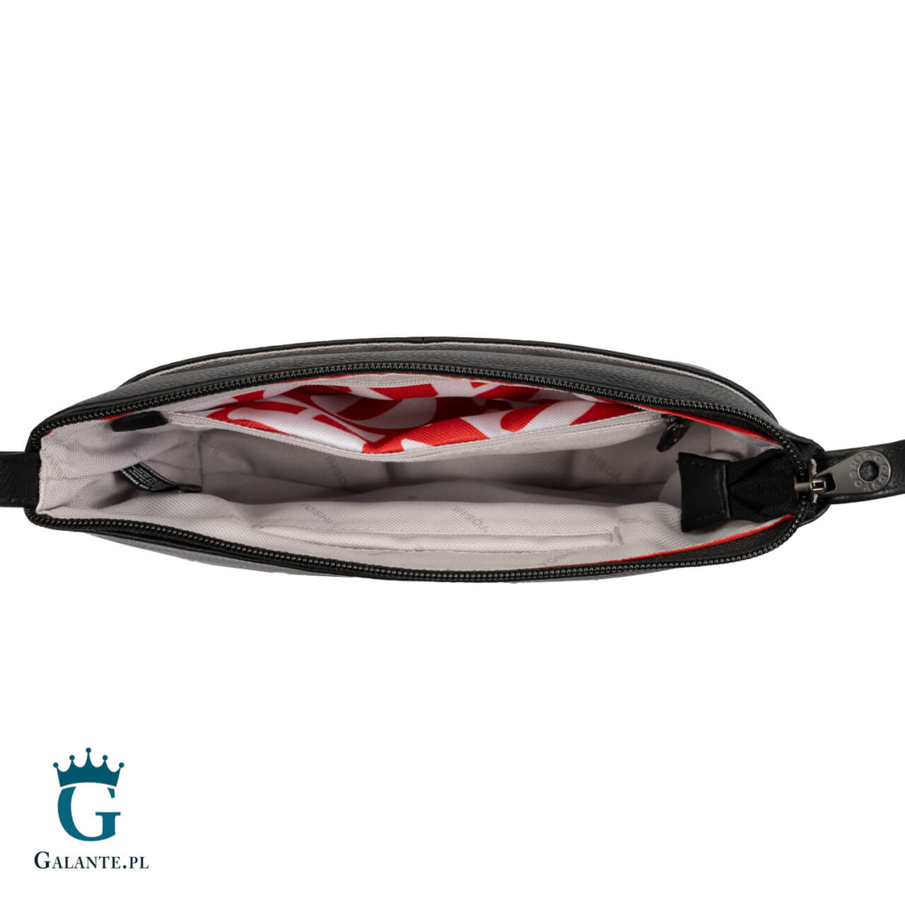 Torebka ma jedną komorę zamykaną na zamek błyskawiczny. Komora ma podszewkę z solidnej mieszanki bawełny i poliestru w kolorze białym, z nadrukiem logo producenta. W środku znajdziemy zamykaną na zamek kieszonkę na portfel lub dokumenty oraz kieszonkę na telefon. Dodatkowo torebka ma jedną zewnętrzną kieszeń wsuwaną.