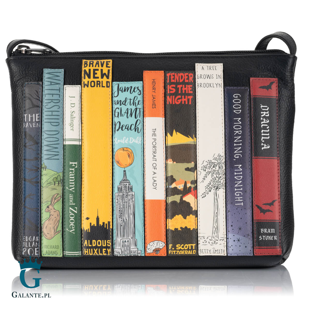 Nieduża listonoszka w klasycznym czarnym kolorze, wykonana z wysokiej jakości skóry naturalnej. Wyróżnia się oryginalnym wzorem – przód torebki został ozdobiony starannie wykonaną naszywką z grzbietami popularnych powieści z kanonu literackiego, takich jak Nowy wspaniały świat Huxsley’a, Portret damy Henry’ego Jamesa czy Drakula Brama Stokera. To idealna torebka dla każdej kobiety, która wolne wieczory najchętniej spędza z książką w ręku. Może być również wspaniałym prezentem dla żony, mamy czy siostry.