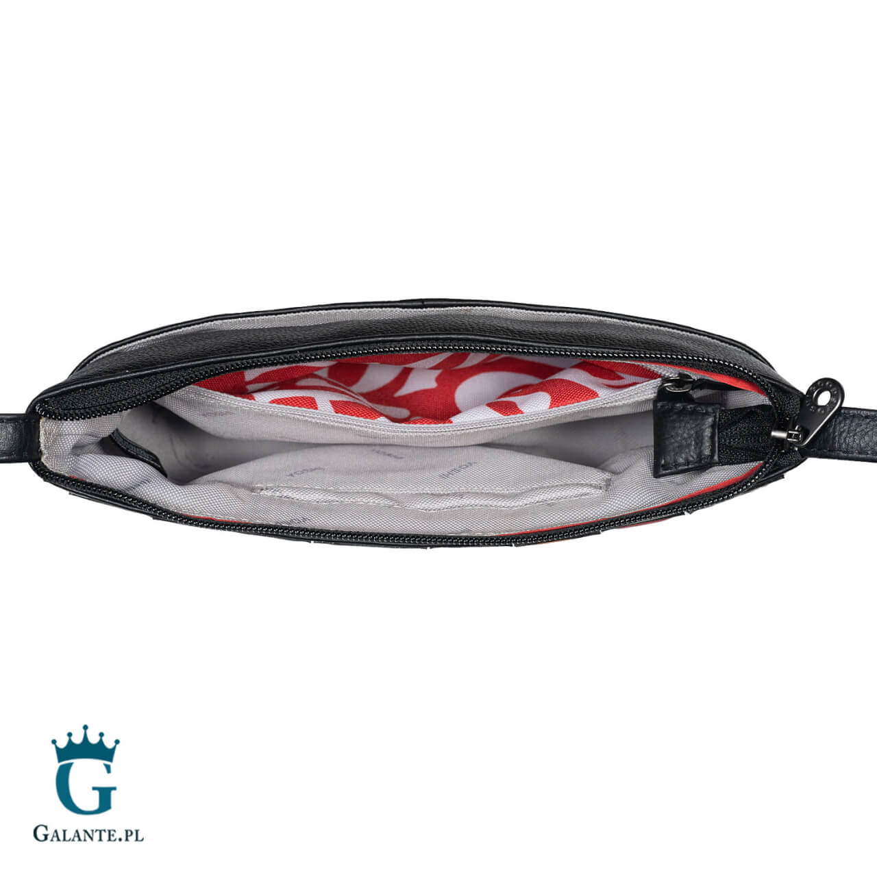 Torebka ma jedną komorę zamykaną na zamek błyskawiczny. Komora ma podszewkę z solidnej mieszanki bawełny i poliestru w kolorze białym, z nadrukiem logo producenta. W środku znajdziemy zamykaną na zamek kieszonkę na portfel lub dokumenty oraz kieszonkę na telefon. Dodatkowo torebka ma jedną zewnętrzną kieszeń wsuwaną.