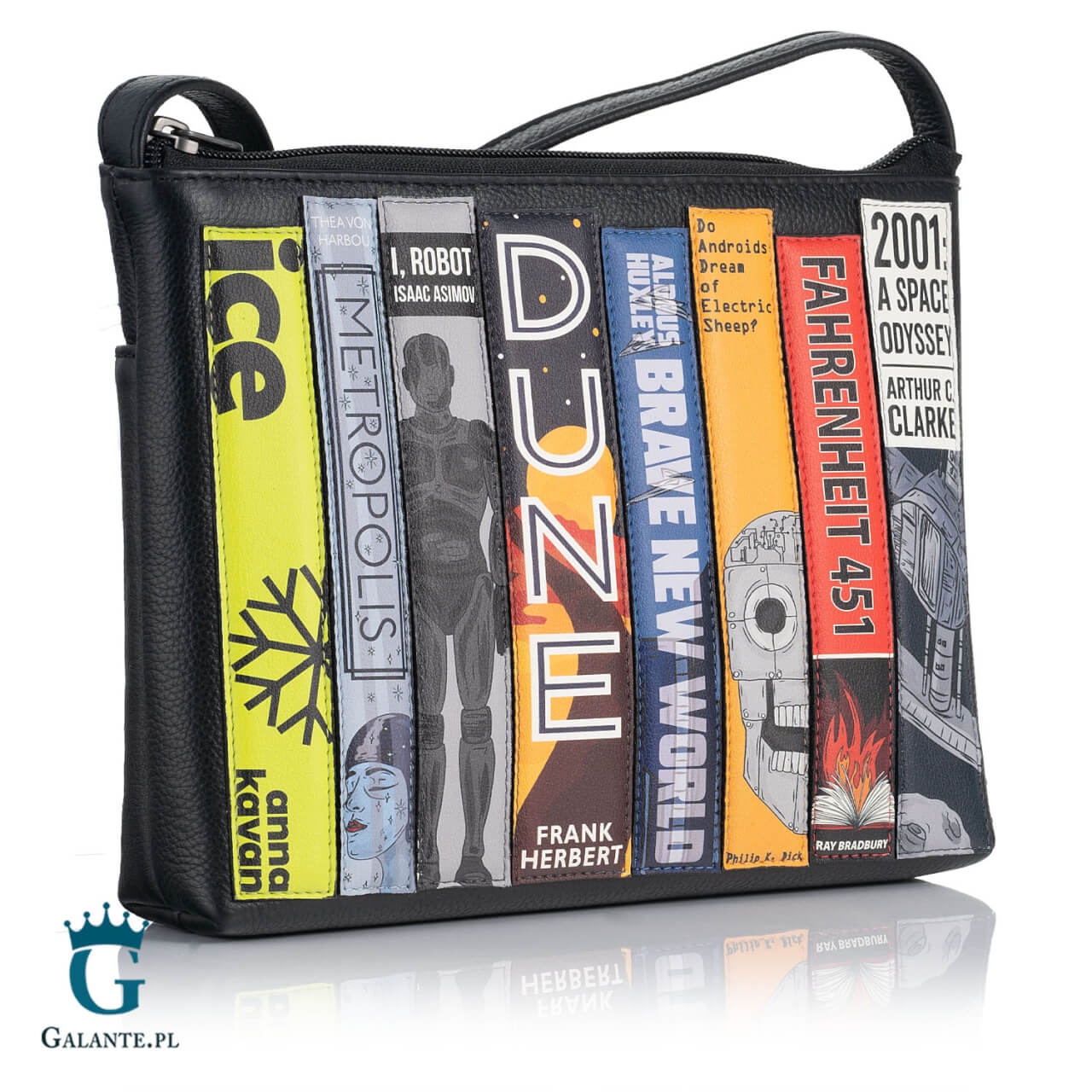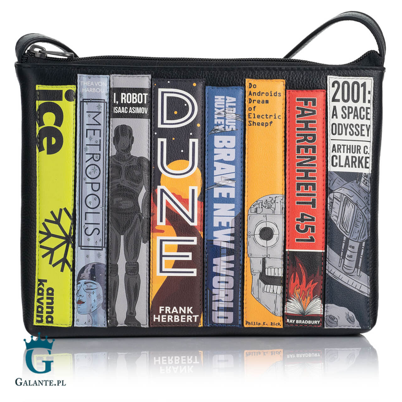 Nieduża, zgrabna torebka skórzana brytyjskiej marki Yoshi wyróżnia się oryginalnym stylem. Przód torebki ozdabia naszywka grzbietów książek stanowiących klasykę gatunku science fiction – Diuna Herberta, Neuromancer Gibsona czy 451 stopni Fahrenheita Raya Bradburego. Jeśli jesteś molem książkowym – lub szukasz prezentu dla takiej osoby – ta torebka to strzał w dziesiątkę! Torebka jest wykonana z czarnej skóry naturalnej wysokiej jakości, odpornej na zarysowania czy uszkodzenia.