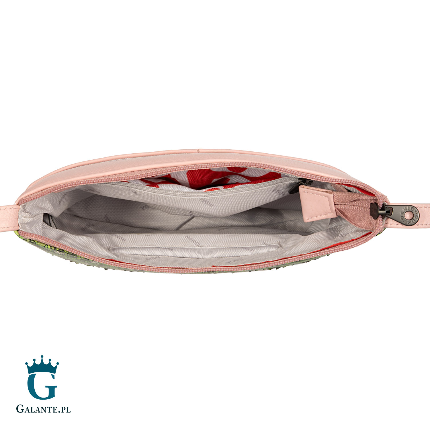 Torebka ma jedną komorę zamykaną na zamek błyskawiczny. Komora ma podszewkę z solidnej mieszanki bawełny i poliestru w kolorze białym, z nadrukiem logo producenta. W środku znajdziemy zamykaną na zamek kieszonkę na portfel lub dokumenty oraz kieszonkę na telefon. Dodatkowo torebka ma jedną zewnętrzną kieszeń wsuwaną.