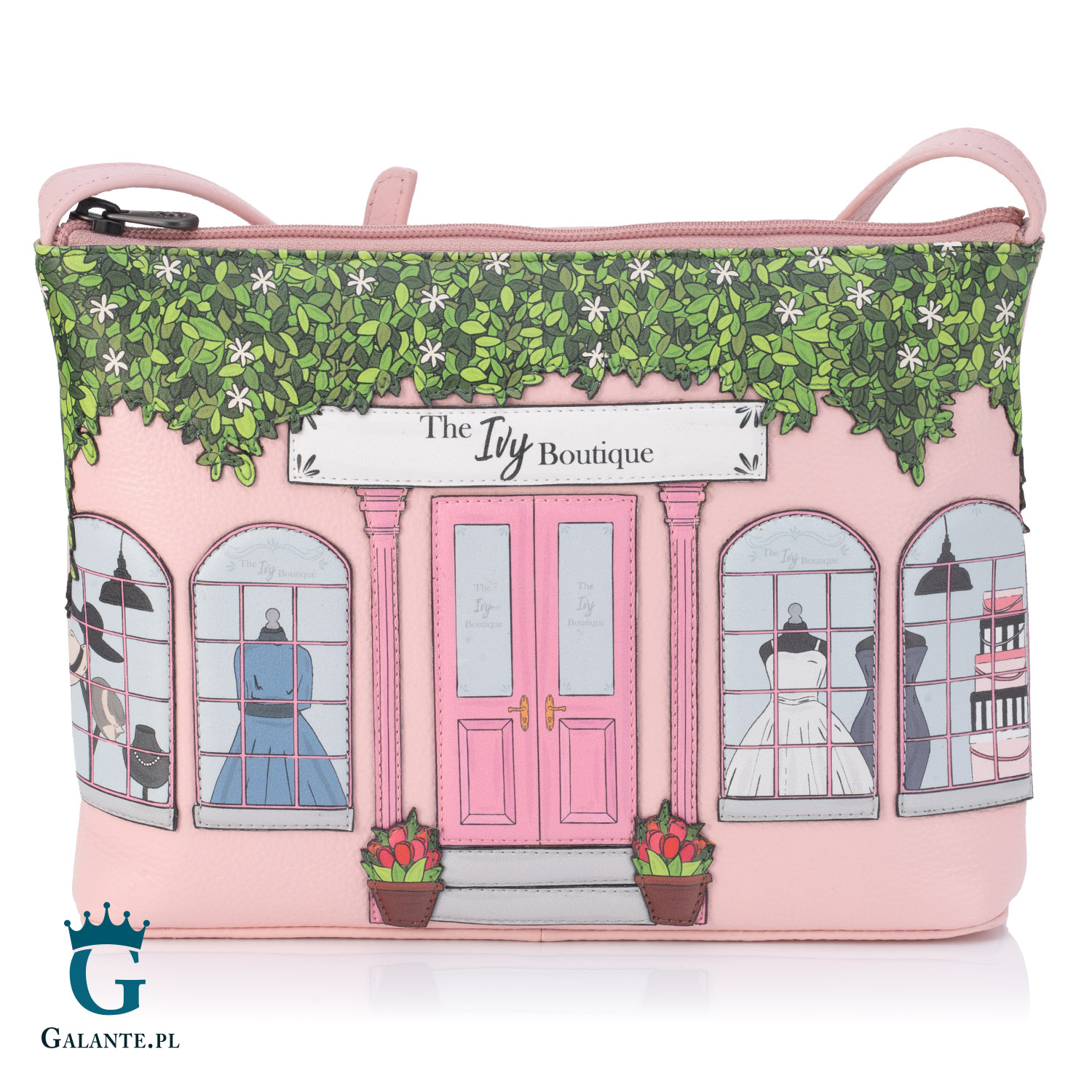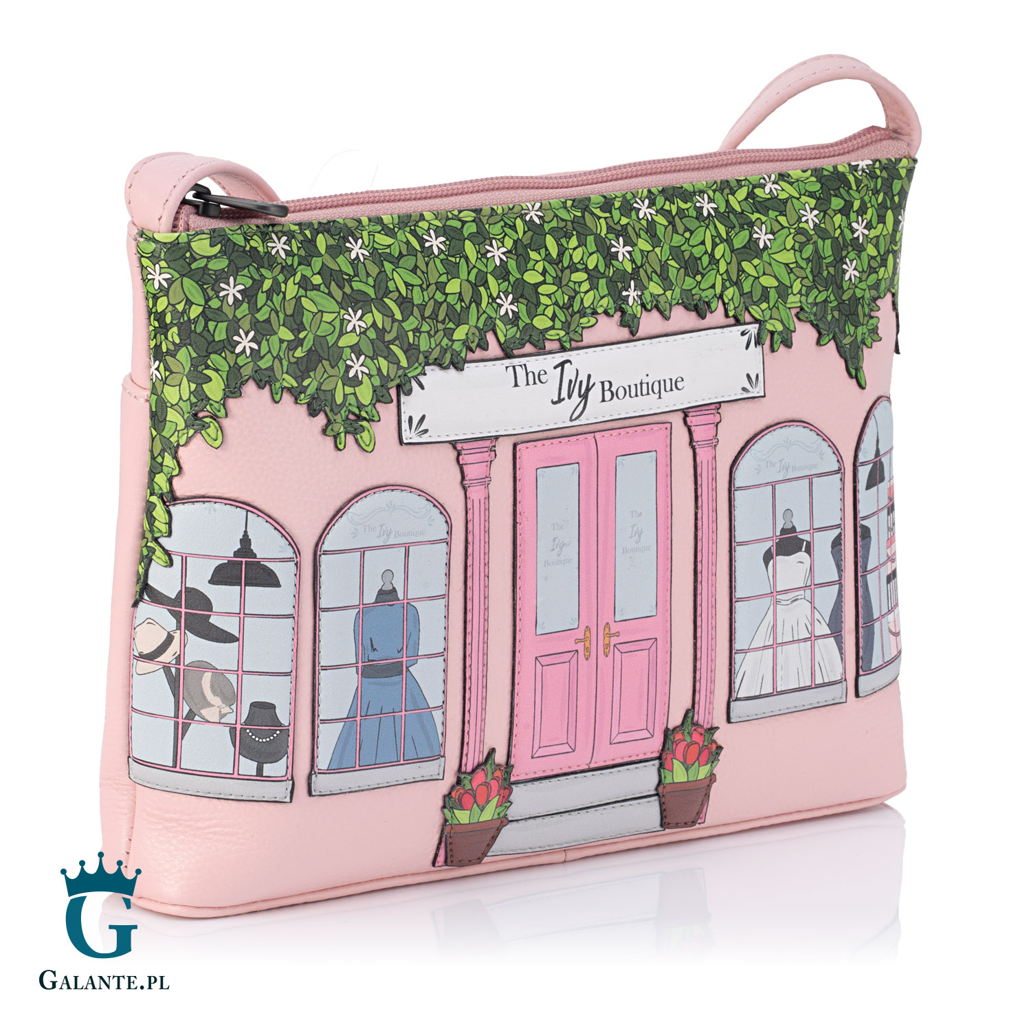 Oto torebka, wobec której nie sposób przejść obojętnie. Oryginalna i bardzo kobieca, wykonana ze skóry naturalnej barwionej na kolor pudrowego różu, na okładce jest ozdobiona szczegółowo wykonaną naszywką przedstawiającą ekskluzywny butikowy sklep z damską odzieżą. Niezwykły wzór, piękna kolorystyka i jakość wykonania podbiją serce każdej kobiety, która szuka portfela innego niż wszystkie. Torebka jest częścią kolekcji “Modny Butik” brytyjskiej marki Yoshi, specjalizującej się w galanterii damskiej o niezwykłej kolorystyce i wzornictwie.