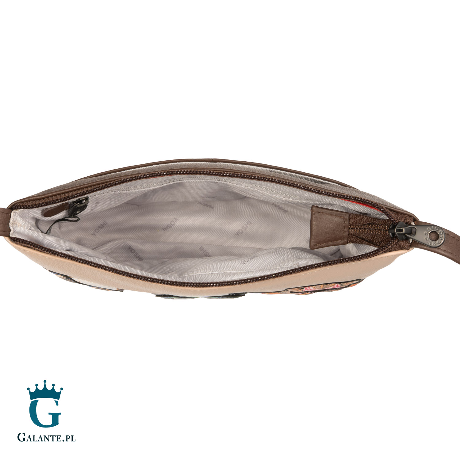Torebka ma jedną komorę zamykaną na zamek błyskawiczny. Komora ma podszewkę z solidnej mieszanki bawełny i poliestru w kolorze białym, z nadrukiem logo producenta. W środku znajdziemy zamykaną na zamek kieszonkę na portfel lub dokumenty oraz kieszonkę na telefon. Dodatkowo torebka ma jedną zewnętrzną kieszeń wsuwaną.