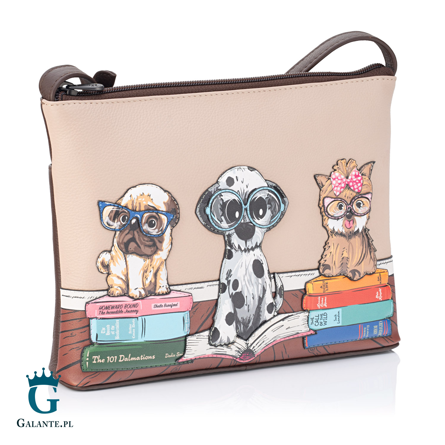 Nieduża listonoszka stworzona przez brytyjską markę Yoshi przyciąga uwagę oryginalnym wzorem i kolorystyką. Uszyta ze skóry naturalnej w dwóch odcieniach brązu, z przodu jest ozdobiona uroczą i zabawną naszywką przedstawiającą psi gang moli książkowych. Mops, dalmatyńczyk oraz York w poważnych okularach na mordkach, siedzące na stosach książek – to obrazek, który rozbawi i rozczuli każdą miłośniczkę psów nawet w najbardziej ponury i pracowity dzień. Idealny gadżet lub upominek dla właścicielki pieska!