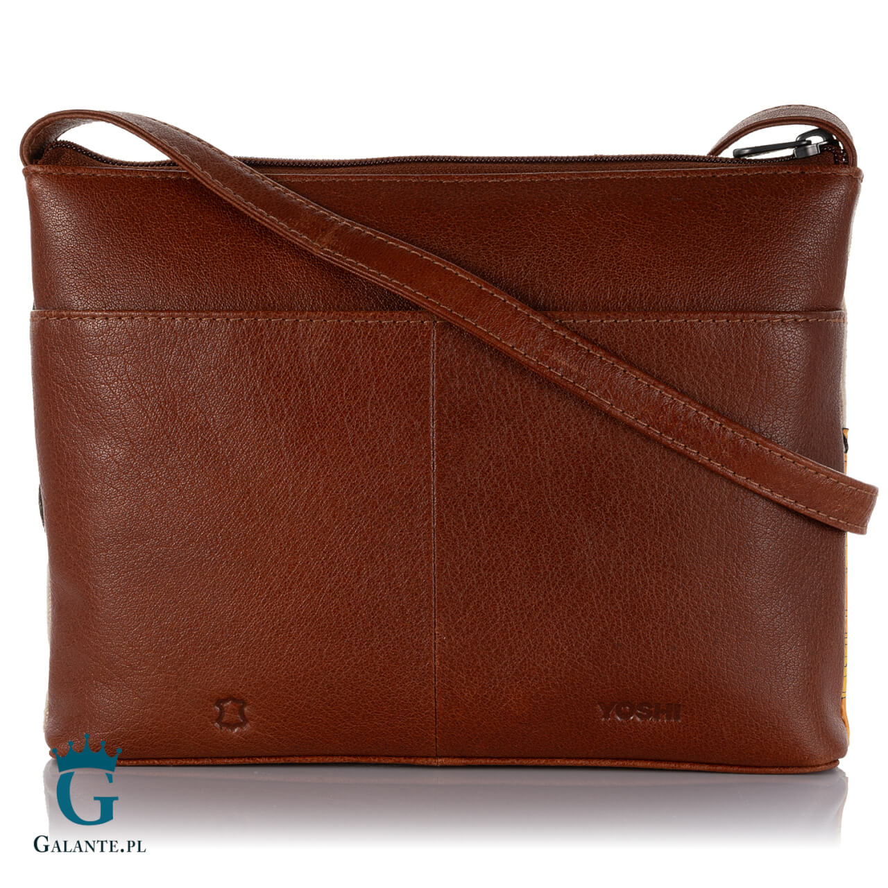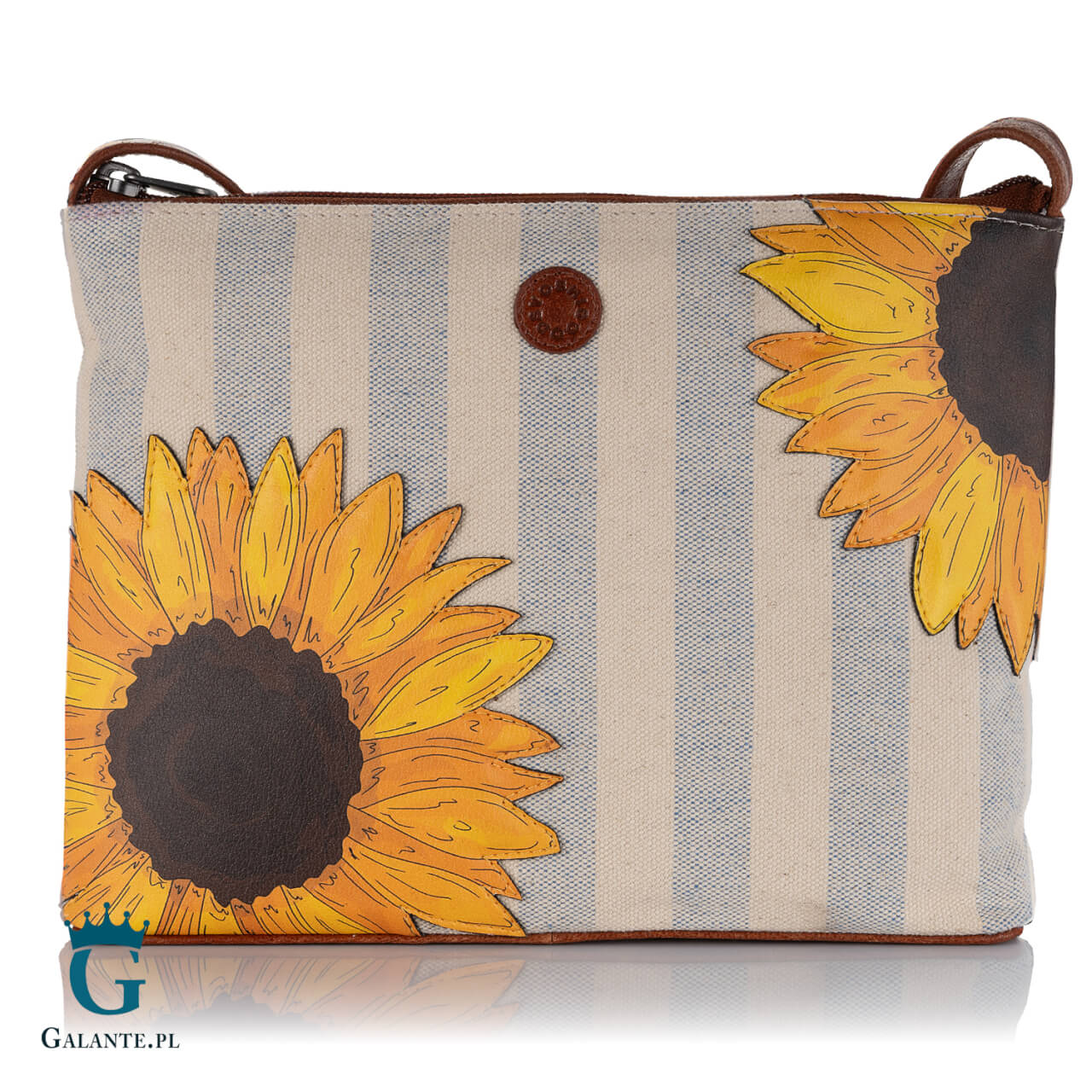Nieduża miejska listonoszka brytyjskiej marki Yoshi wyróżnia się oryginalnym wzorem i kolorystyką. Wykonana z miękkiej skóry naturalnej w kolorze ciepłego, orzechowego brązu, została ozdobiona wiosennym wzorem kwiatów słonecznika, naszytych na warstwę pastelowego płótna w delikatnie zarysowane pasy. Żółte kwiaty na tle złocistych i niebieskich pasów to kwintesencja letnich, słonecznych dni. Wykorzystanie szorstkiego płótna nadaje tej kolekcji bardzo nowoczesnego charakteru.