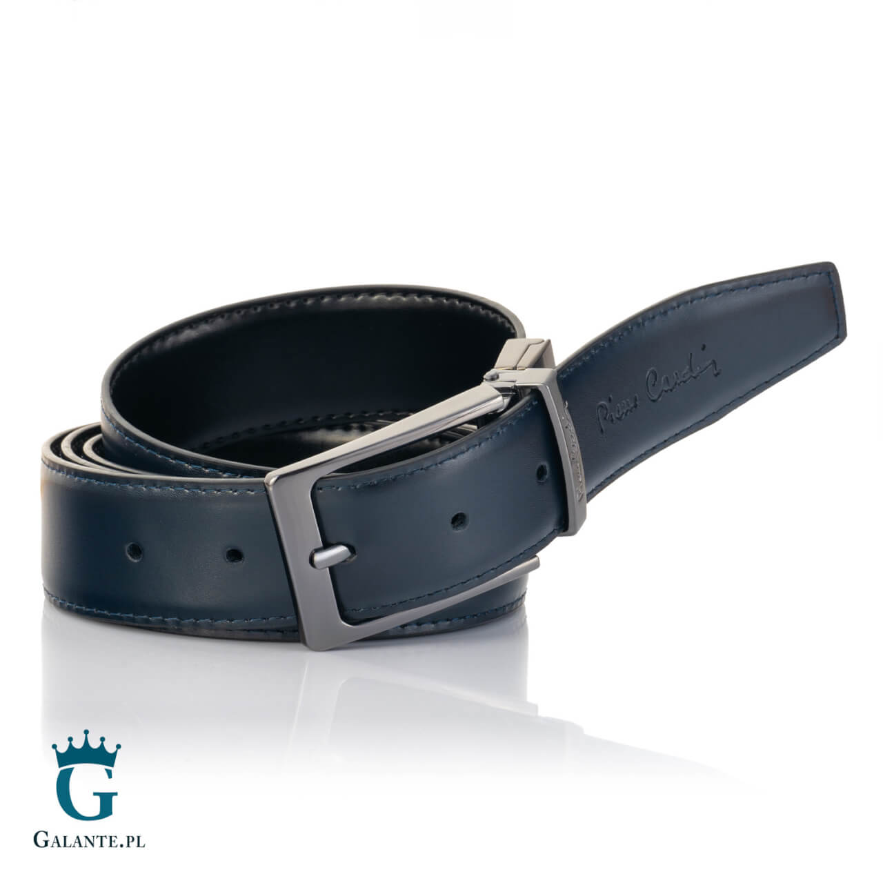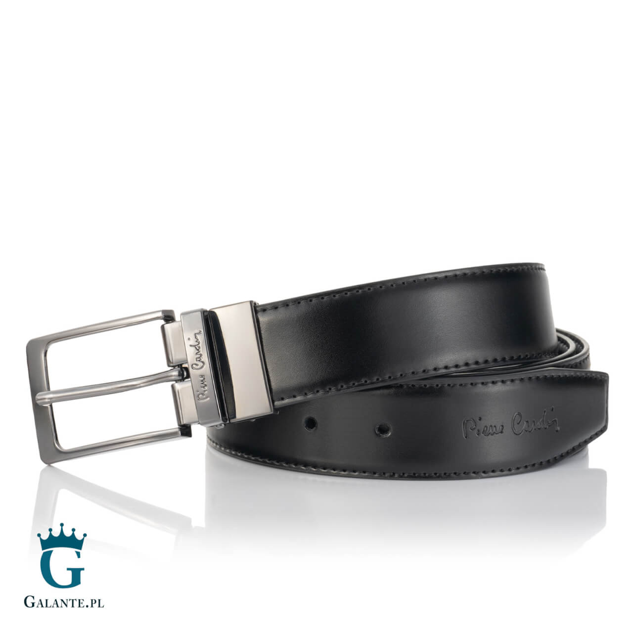 Drugim dodatkiem znajdującym się w zestawie prezentowym jest elegancki pasek do spodni firmy Pierre Cardin FWJX5. Opatrzony nazwą marki, ozdobiony klamrą w kolorze ciemnego, oksydowanego srebrna wspaniale pasuje do garnituru. Klamra nie zawiera niklu, więc jest odpowiednia dla alergików. Pasek jest dwustronny, z obracaną sprzączką, w kolorze czarnym i brązowym. Szerokość paska to 33 mm, dzięki czemu będzie pasować zarówno do eleganckich, jak i wieczorowych kreacji. Długość paska mierzona do środkowej dziurki (odpowiadająca obwodowi w pasie) to 115 cm. Istnieje możliwość skrócenia paska od strony klamry.