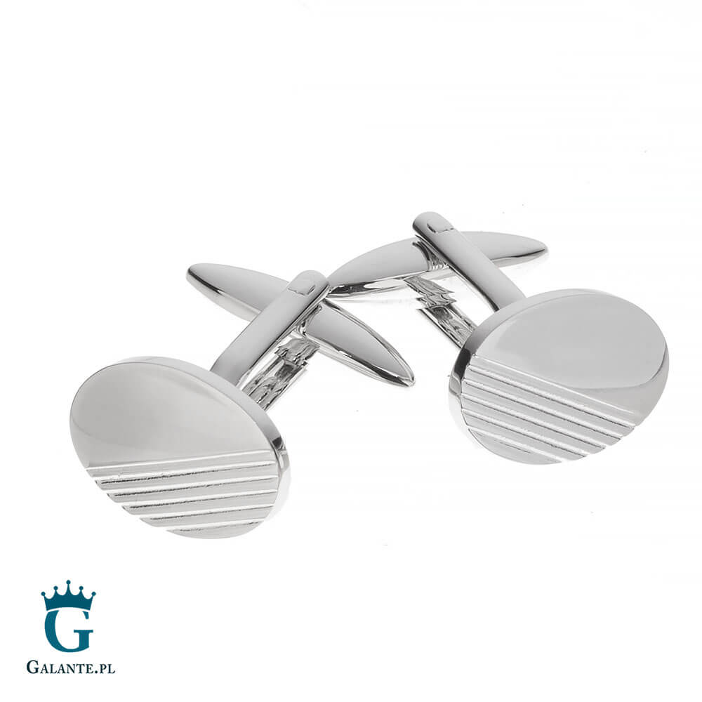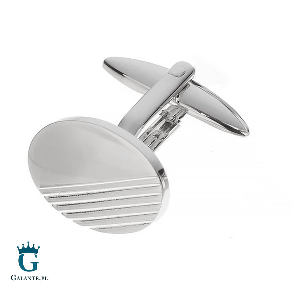 Owalne spinki do mankietów w kolorze srebrnym, wykończone na połysk i zdobione delikatnymi ukośnymi żłobieniami. Niezwykle eleganckie, pasują zarówno do białej, jak i ciemnej koszuli. Spinki są wykonane ze stali szlachetnej pokrytej galwaniczną warstwą rodu zapewniającą trwały kolor. Nie uczulają i nie ciemnieją w czasie użytkowania.