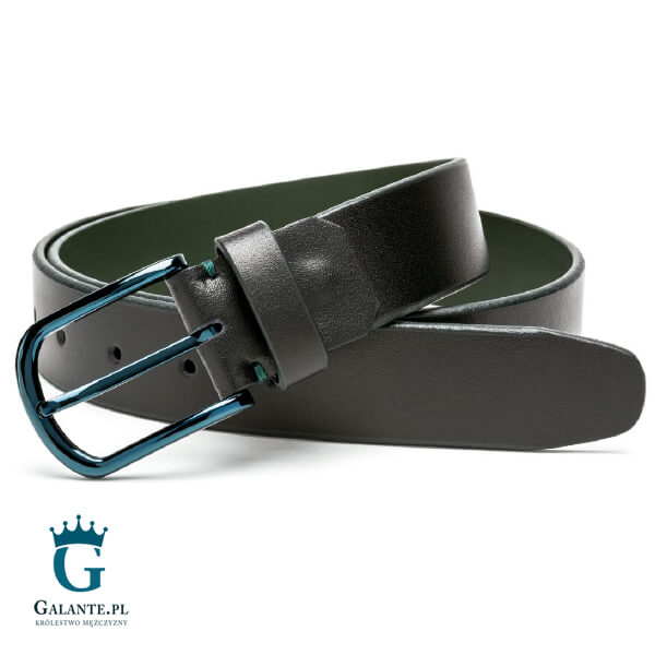 Pasek jest unikatowym modelem dzięki swojemu efektownemu, a jednocześnie delikatnemu designowi. Ten model to pasek męski ze skóry naturalnej będący połączeniem barwy czarnej z ciemnozieloną. Brzegi czarnego paska mają kolor ciemnej zieleni, do której pasuje klasyczna klamra o tej samej barwie. Dzięki tym kolorom pasek będzie wyglądał gustownie zarówno do garnituru, jak i w stylizacjach casualowych. Jego powierzchnia jest gładka i posiada on pięć dziurek, co 2,5 cm. Szerokość paska wynosi 3,5 cm.