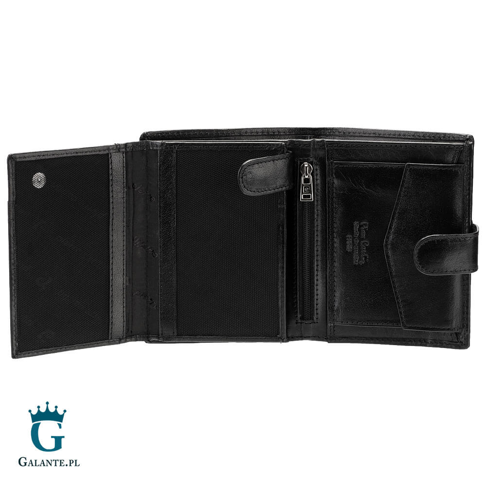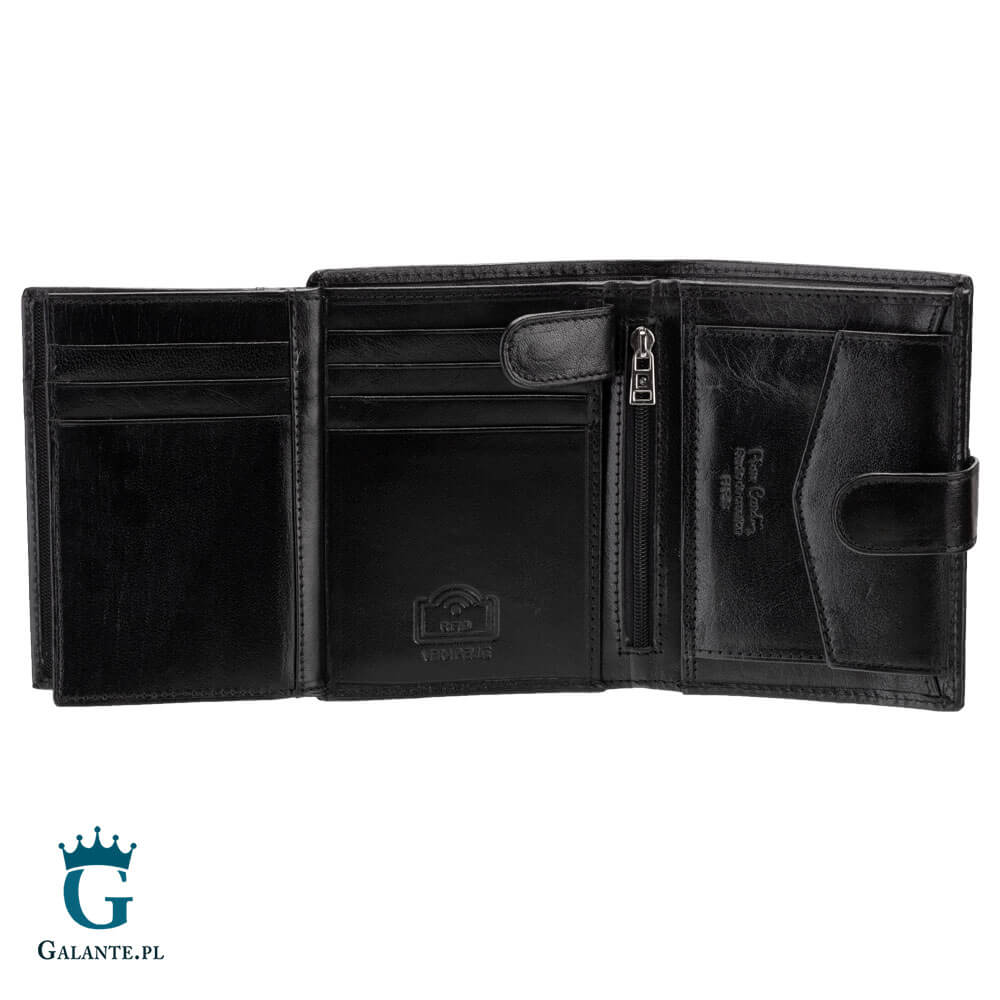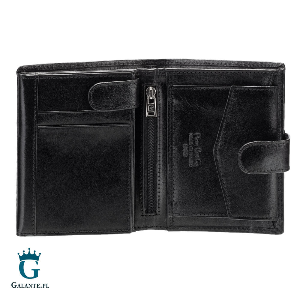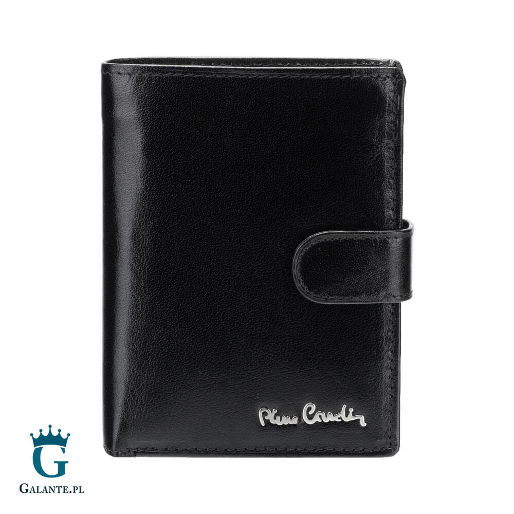 Mężczyznom ceniącym dodatki o wysokiej jakości proponujemy ten zapinany model portfela znanej marki Pierre Cardin. Portfel ma kolor czarny i jest wykonany ze skóry naturalnej. Ma układ pionowy, jest poręczny, a jego wymiary to 13 cm x 10 cm. Portfel zmieści wszystko, co jest ci potrzebne.