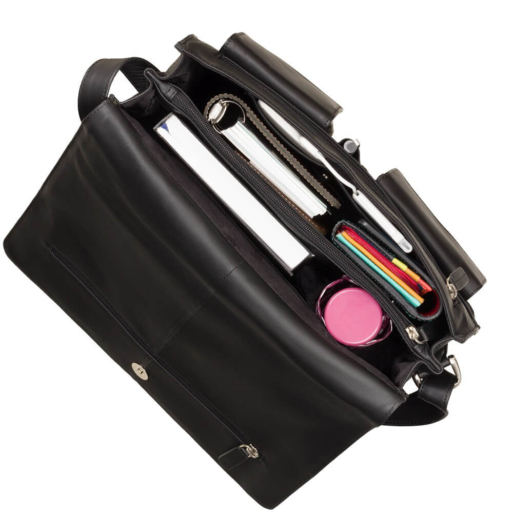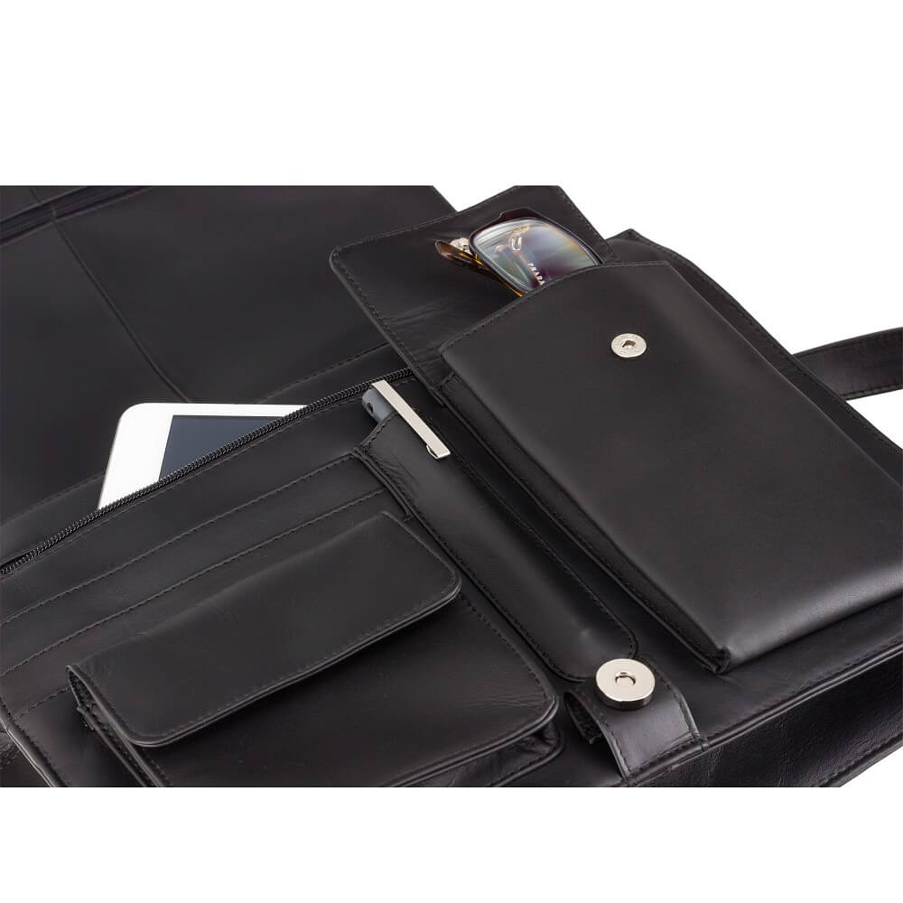 Torba jest wyposażona w wygodny, regulowany pasek na ramię o długości ok. 130 cm i szerokości 2,5 cm. Zamyka się na klapę z jednym zatrzaskiem magnetycznym. Komora główna jest podzielona na dwie części za pomocą kieszeni zamykanej na zamek błyskawiczny (26 x 19 cm). W obu częściach komory głównej znajdują się dwie małe kieszonki na dokumenty i telefon oraz dwie większe, w tym jedna z nich zamykana na zamek. Łącznie komora posiada 8 kieszonek, co pozwala na wygodne rozmieszczenie wszystkich dokumentów, notatek i niezbędnych do pracy drobiazgów. Dodatkowo torba posiada organizer pod klapą – 3 miejsca na wizytówki lub karty magnetyczne, uchwyt na pióro oraz dwie kieszonki na zatrzask. Na zewnątrz torby znajdziemy również 3 duże kieszenie zamykane na zamek błyskawiczny, o wymiarach 2 x 25 x 18 cm oraz 25 x 21 cm.