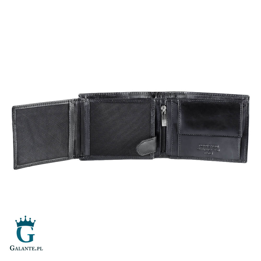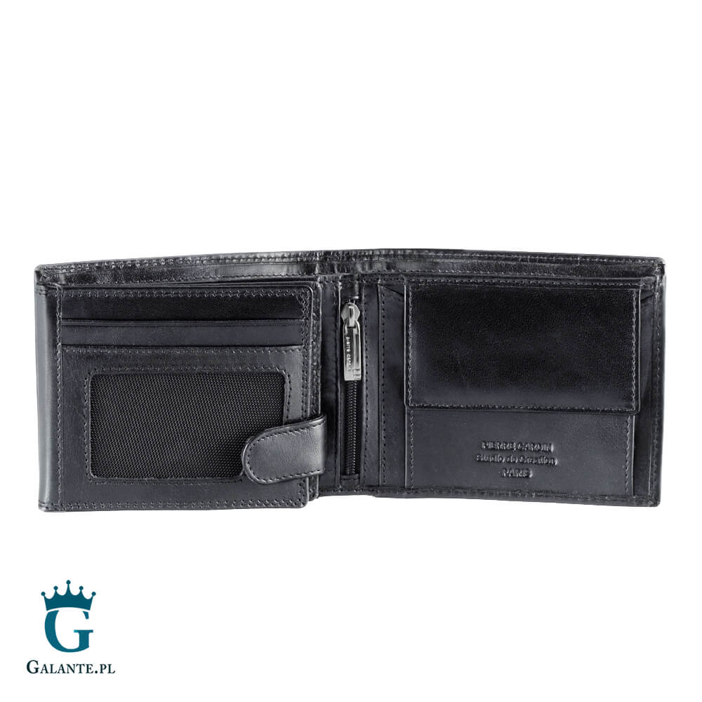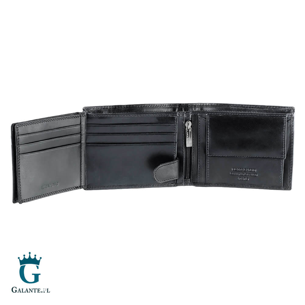 Prezentowany model to elegancki, klasyczny portfel męski wykonany z wysokiej jakości włoskiej skóry licowej w kolorze czarnym. Okładka portfela jest ozdobiona dyskretnym metalowym logo producenta Portfel jest orientacji poziomej, o średnich wymiarach – 12 cm szerokości i 9,5 cm wysokości. Charakteryzuje się dużą liczbą kieszonek i przegródek. Posiada:
