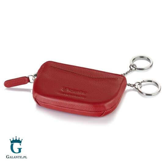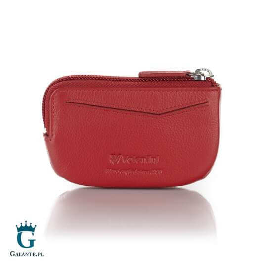 Niewielki portfel damski na bilon i klucze z kolekcji Valentini Prism. Wykonany z miękkiej skóry naturalnej barwionej na klasyczny czerwony kolor, jest ozdobione geometrycznym przeszyciem i tłoczeniem logo producenta na okładce. Etui ma wymiary 11 cm x 7 cm, jest zamykane na zamek błyskawiczny, posiada dwa kółka na klucze oraz zewnętrzną kieszonkę na kartę.