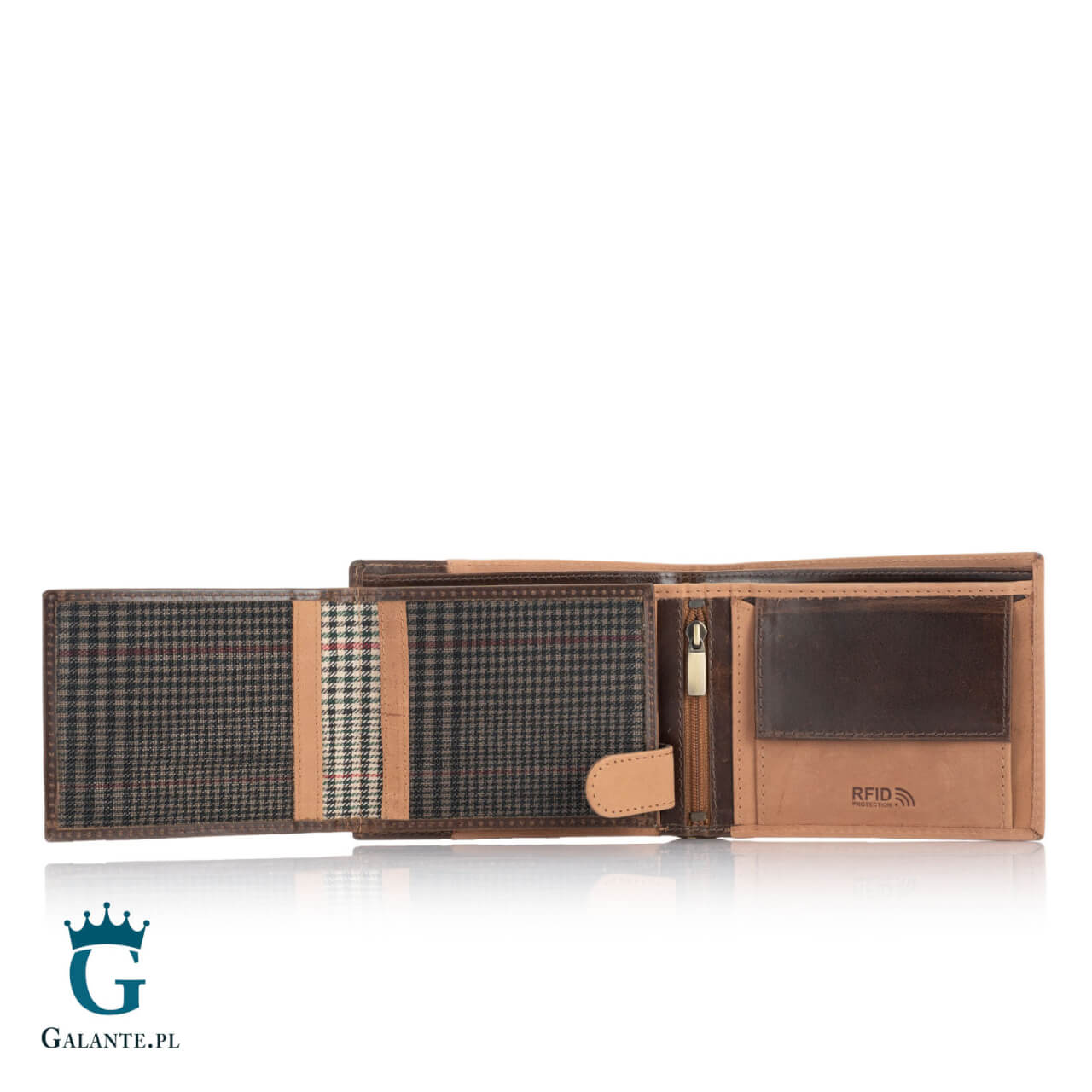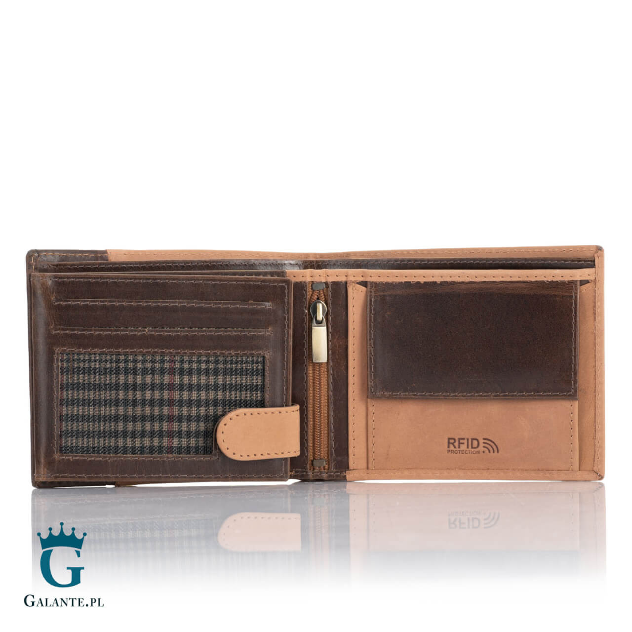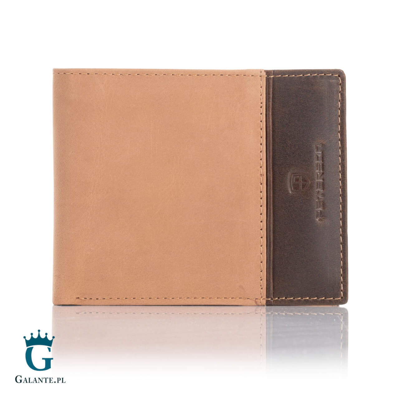 Prezentowany portfel został wykonany z jasnobrązowej skóry nubuk połączonej z ciemnobrązową, gładką skórą naturalną. Połączenie miękkiej, zamszowej skóry nubukowej i gładkiej skóry naturalnej jest wyjątkowo oryginalne i eleganckie. Dyskretne tłoczenie nazwy i logo producenta na okładce stanowią stylowe wykończenie.