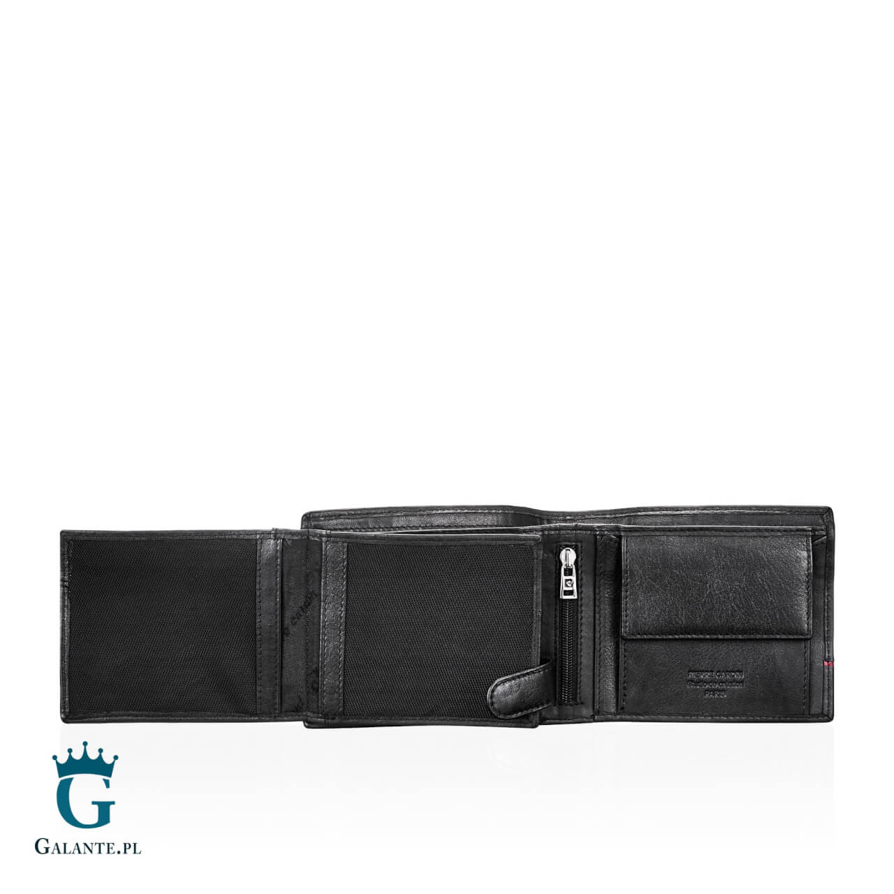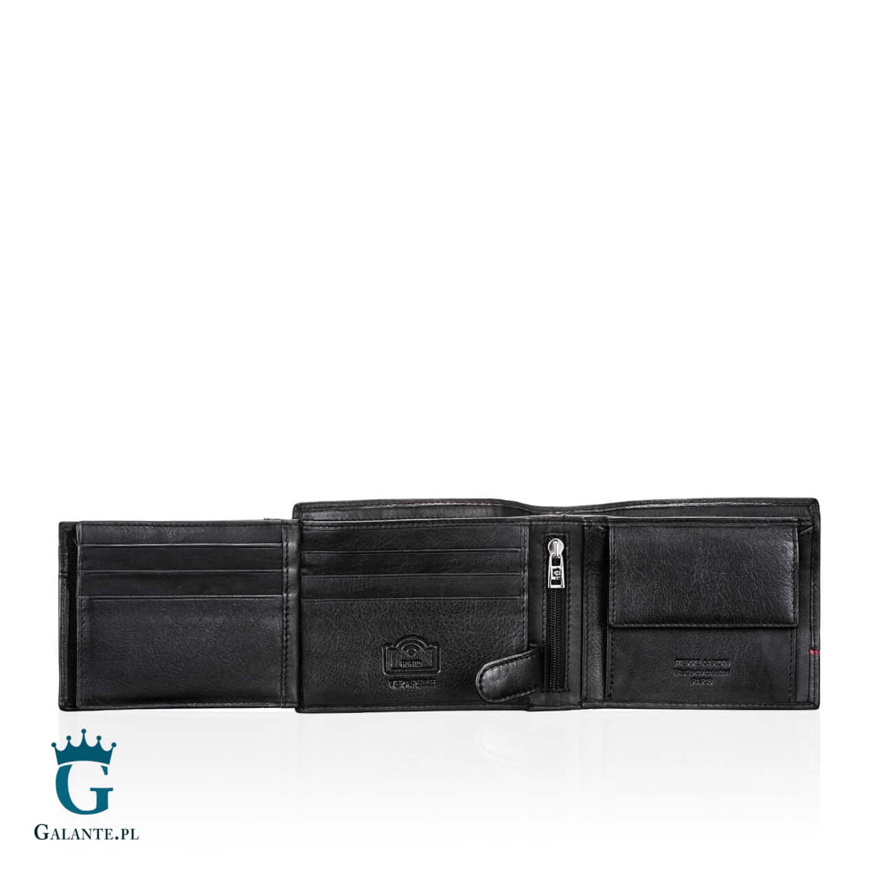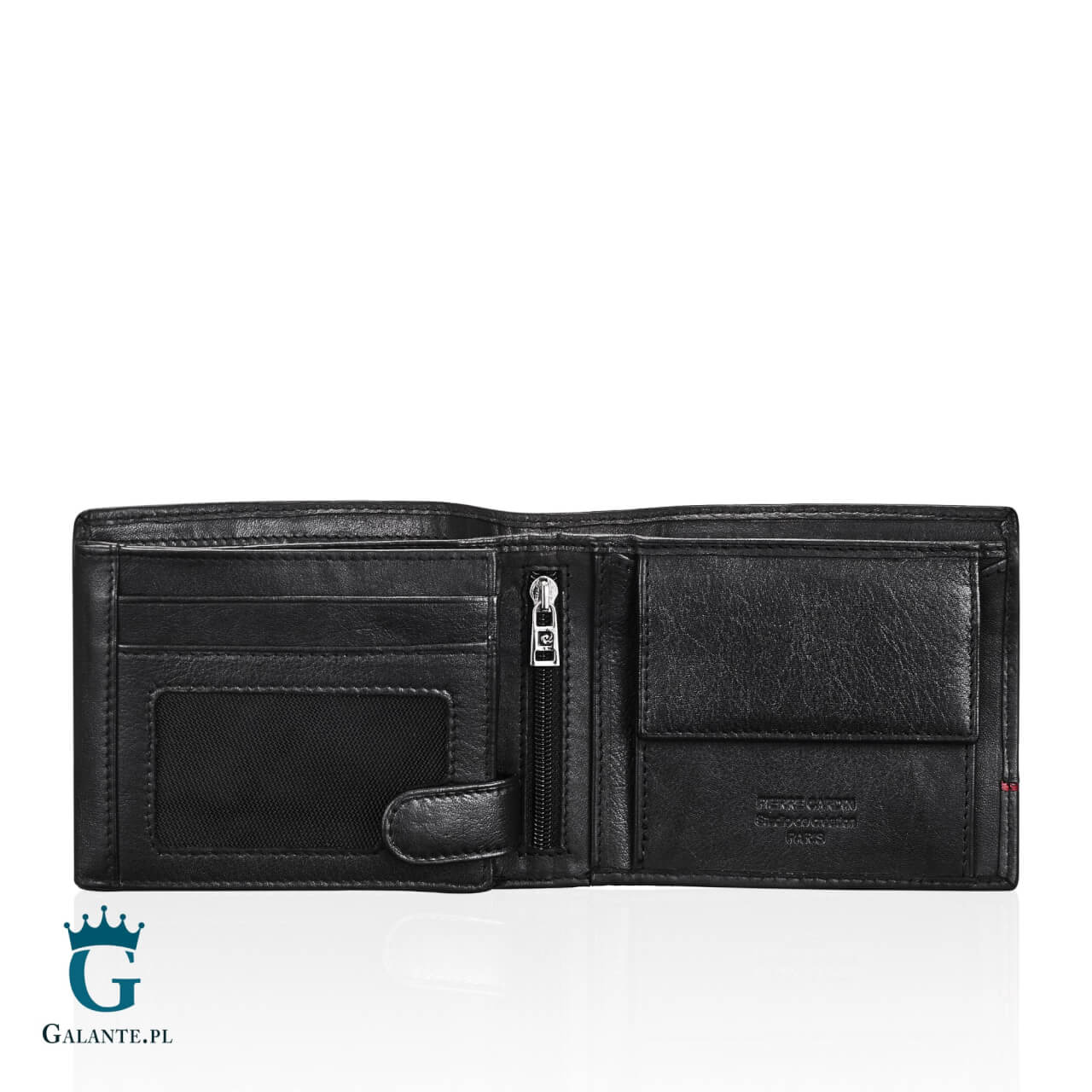 Całość wykonana z naturalnej skóry koloru czarnego z delikatnym czerwonym lub niebieskim paskiem biegnącym przez wewnętrzną część portfela Pierre Cardin.
